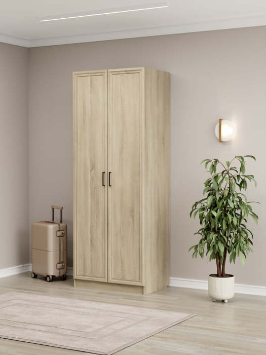Шкаф имеет габариты 80 см в ширину, 52 см в глубину и 210 см в высоту. Фасады изготовлены из МДФ, корпус выполнен из ЛДСП. Такое сочетание материалов обеспечивает прочность и долговечность конструкции, устойчивость к повседневным нагрузкам, а также привлекательный внешний вид изделия. Внутри располагается двухстворчатое отделение с горизонтальной штангой для белья, рассчитанной на нагрузку до 10 кг. Помимо этого, предусмотрено 7 полок для размещения вещей, коробок или декоративных предметов.