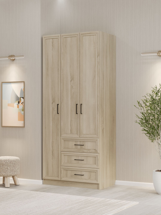 Шкаф распашной ШК‑3/5 — компактное и функциональное решение для организации хранения в спальне, прихожей или гостиной. Трёхдверный шкаф со штангой, полками и выдвижными ящиками позволяет рационально использовать пространство даже в небольших помещениях. Сочетание материалов (МДФ для фасадов и ЛДСП для корпуса) обеспечивает прочность, долговечность и эстетичный внешний вид изделия. Лаконичный дизайн шкафа органично вписывается в современные интерьеры.