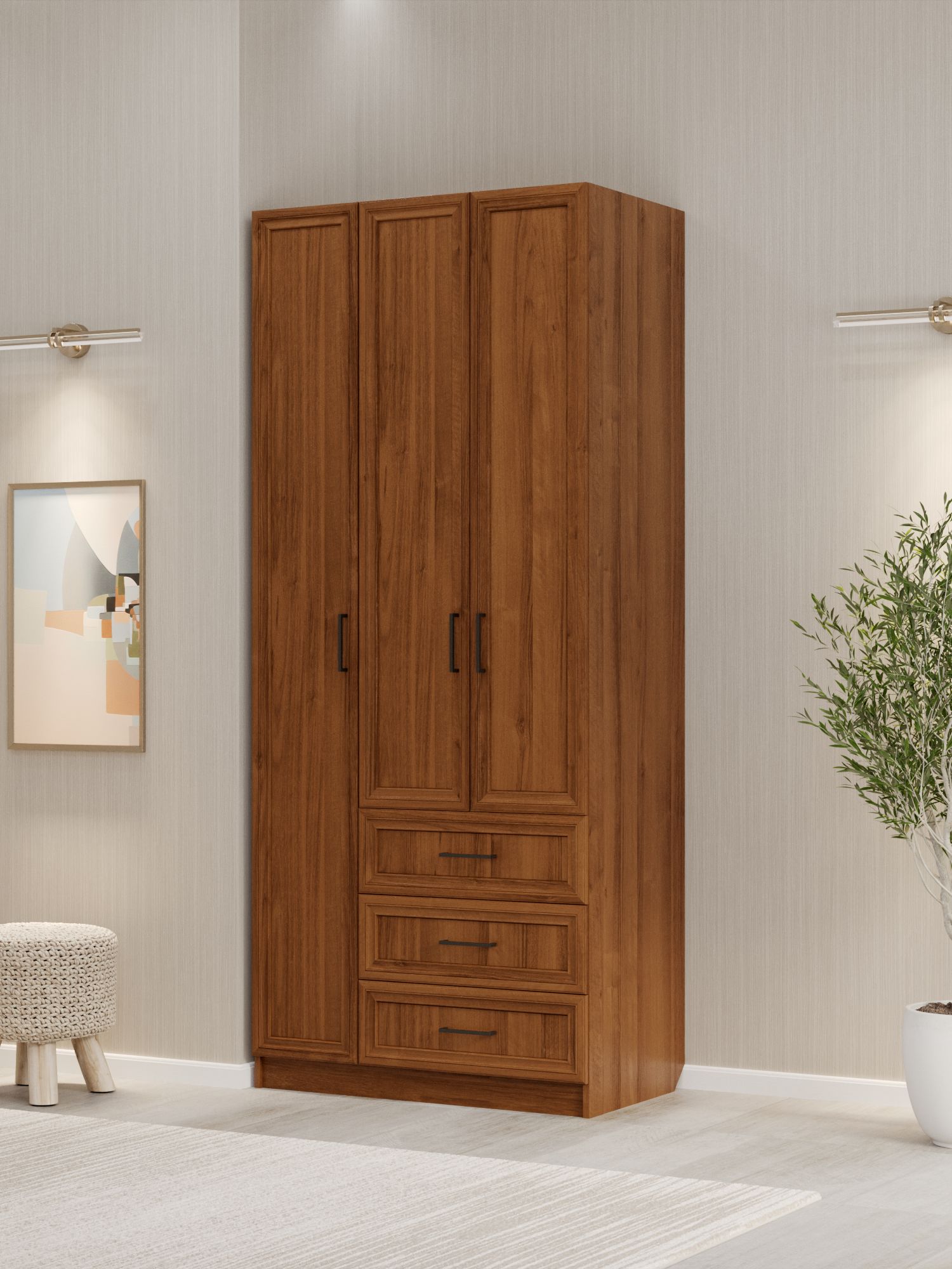Шкаф распашной ШК‑3/5 — компактное и функциональное решение для организации хранения в спальне, прихожей или гостиной. Трёхдверный шкаф со штангой, полками и выдвижными ящиками позволяет рационально использовать пространство даже в небольших помещениях. Сочетание материалов (МДФ для фасадов и ЛДСП для корпуса) обеспечивает прочность, долговечность и эстетичный внешний вид изделия. Лаконичный дизайн шкафа органично вписывается в современные интерьеры.