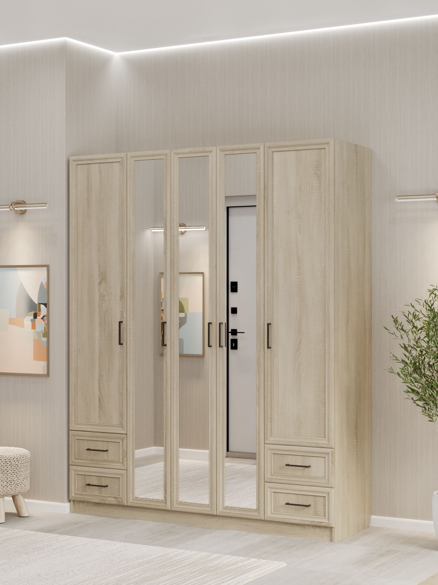 Шкаф распашной ШК‑5/7 — вместительное и функциональное решение для организации хранения в спальне, гостиной или прихожей. Пятидверный шкаф с двумя штангами, обширным набором полок и выдвижными ящиками позволяет максимально эффективно использовать пространство. Фасад из МДФ и корпус из ЛДСП гарантируют прочность конструкции, долговечность и эстетичный внешний вид. Нейтральный дизайн шкафа легко вписывается в современные интерьеры разных стилевых направлений.
