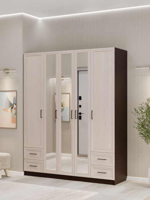 Шкаф распашной ШК‑5/7 — вместительное и функциональное решение для организации хранения в спальне, гостиной или прихожей. Пятидверный шкаф с двумя штангами, обширным набором полок и выдвижными ящиками позволяет максимально эффективно использовать пространство. Фасад из МДФ и корпус из ЛДСП гарантируют прочность конструкции, долговечность и эстетичный внешний вид. Нейтральный дизайн шкафа легко вписывается в современные интерьеры разных стилевых направлений.