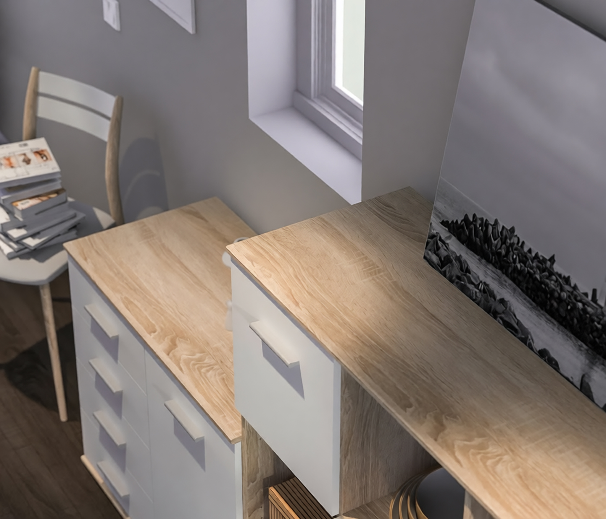 Комод Мамбо выполнен из прочного и влагоустойчивого материала. Все выдвижные механизмы прочные и имеют солидный ресурс.
