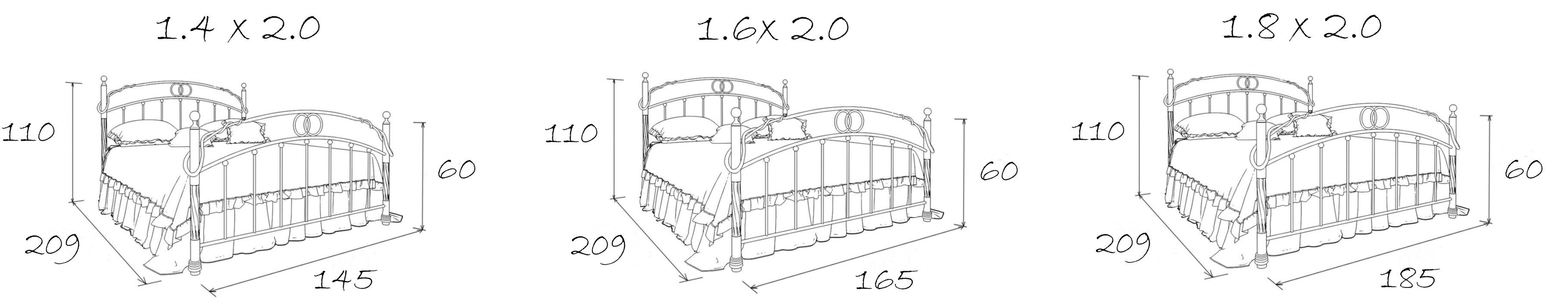Размеры спального места (ДхШ) 2000х1600высота изножья 600 мм, максимальная нагрузка на 1 спальное место - 150 кг.