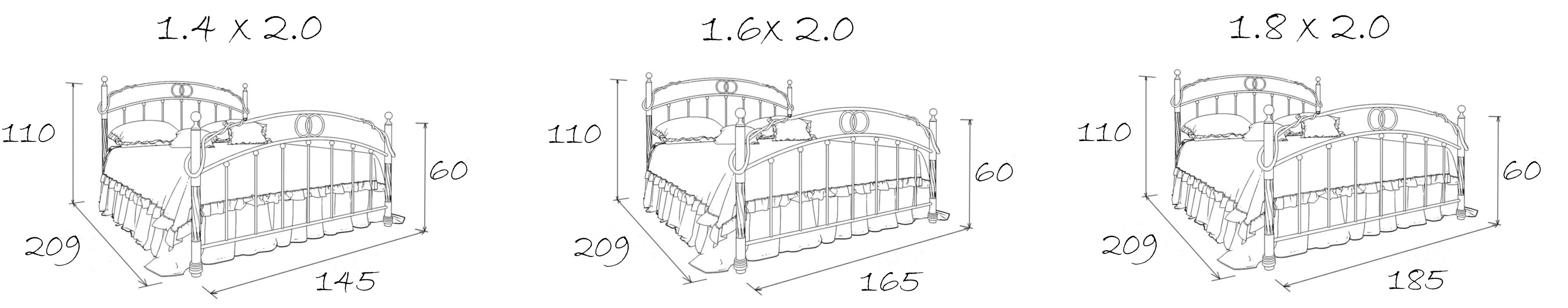 Размеры спального места (ДхШ) 2000х1600, высота изножья 600 мм, максимальная нагрузка на 1 спальное место - 150 кг.