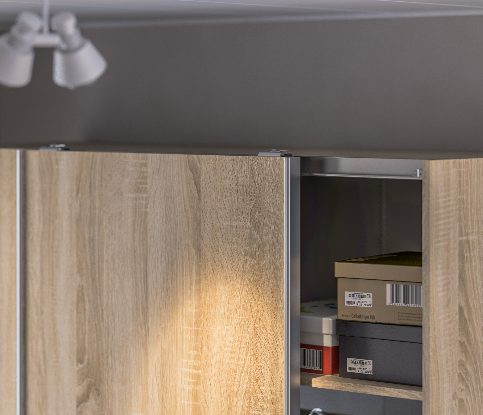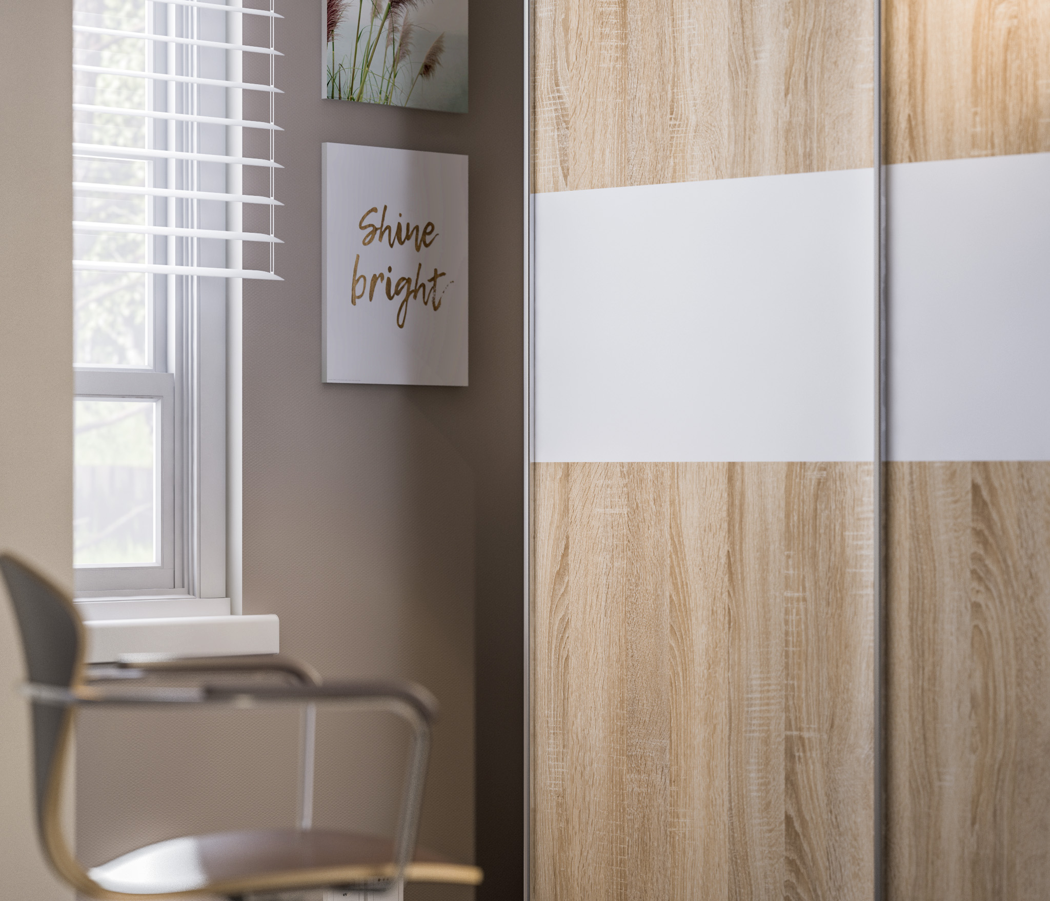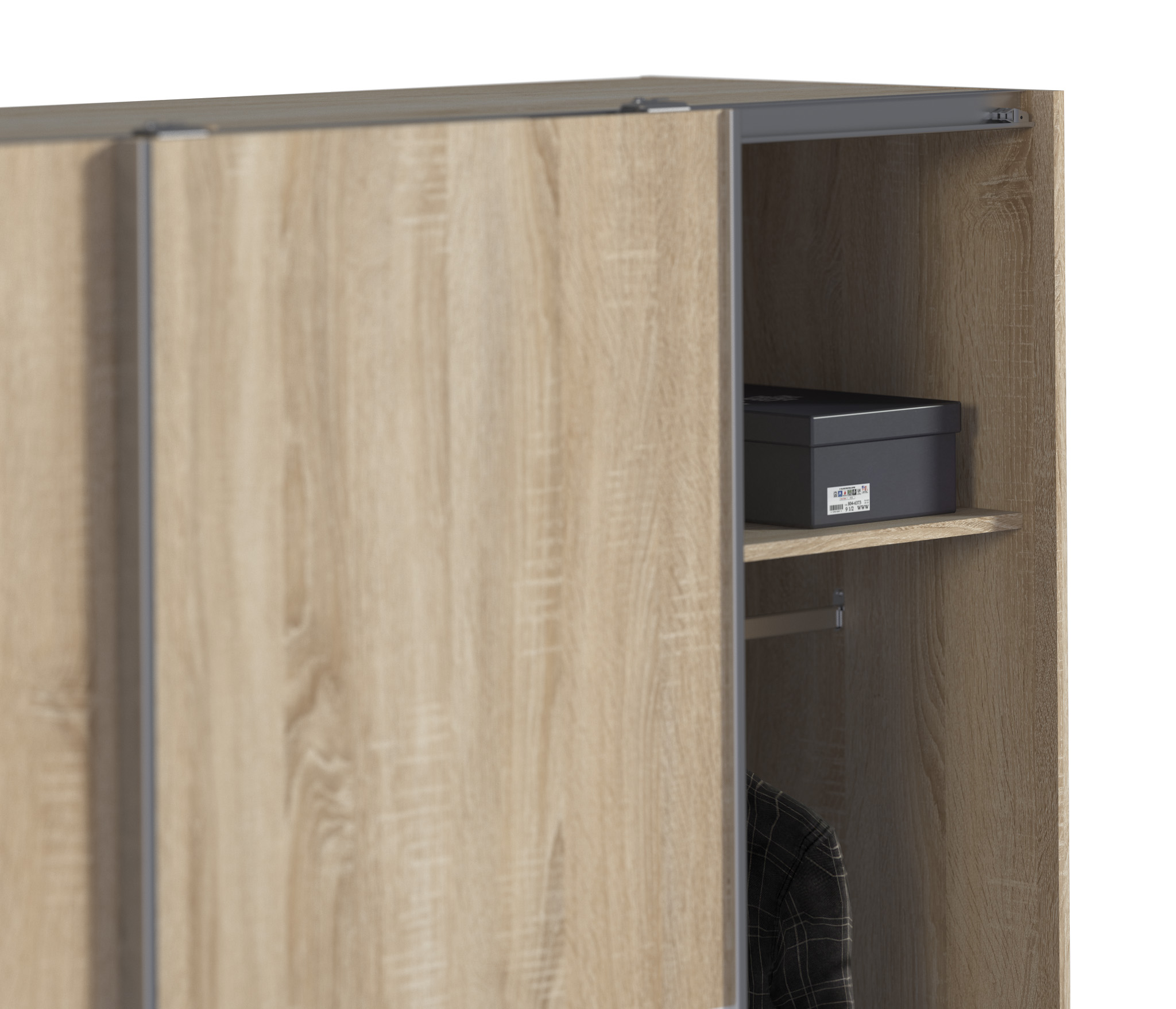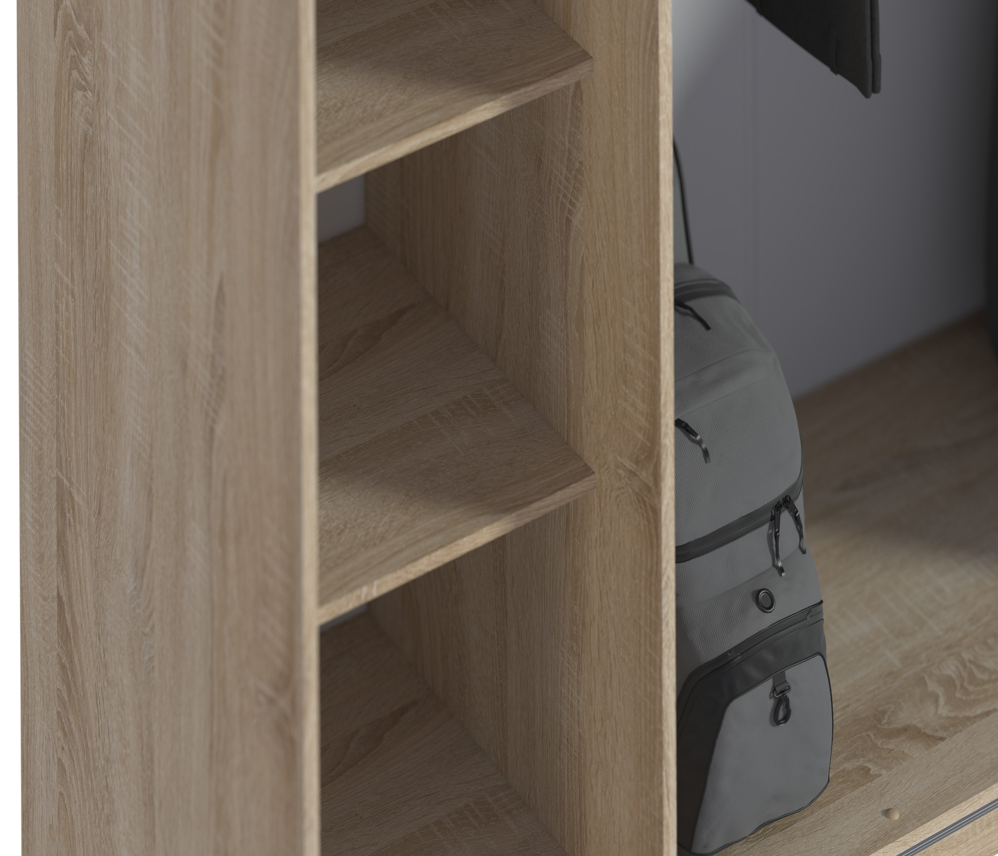 Корпус модели произведен из прочного ламинированного ДСП. Отделка корпуса в цвете «Дуб Сонома». Отделка фасадных поверхностей – сочетание цветов белого и «Дуб Сонома».