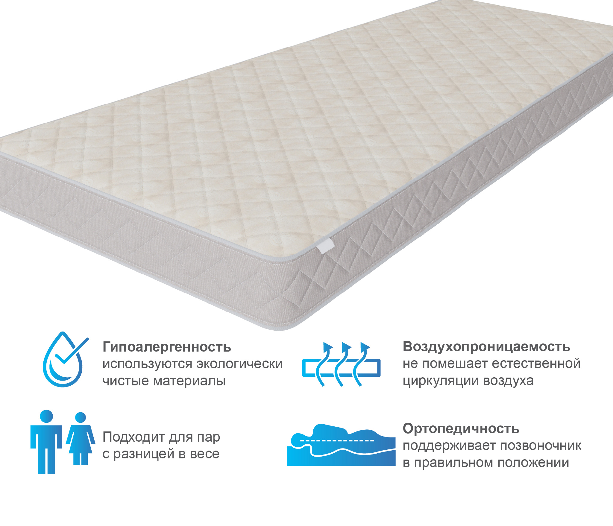Это классическая конструкция матраса, универсальный блок пружин с точечной поддержкой, термоволокно, которое защитит комфортные слои от соприкосновения с пружинами и соответственно истерания. Слои кокоса добавят необходимой жесткости и прочности.