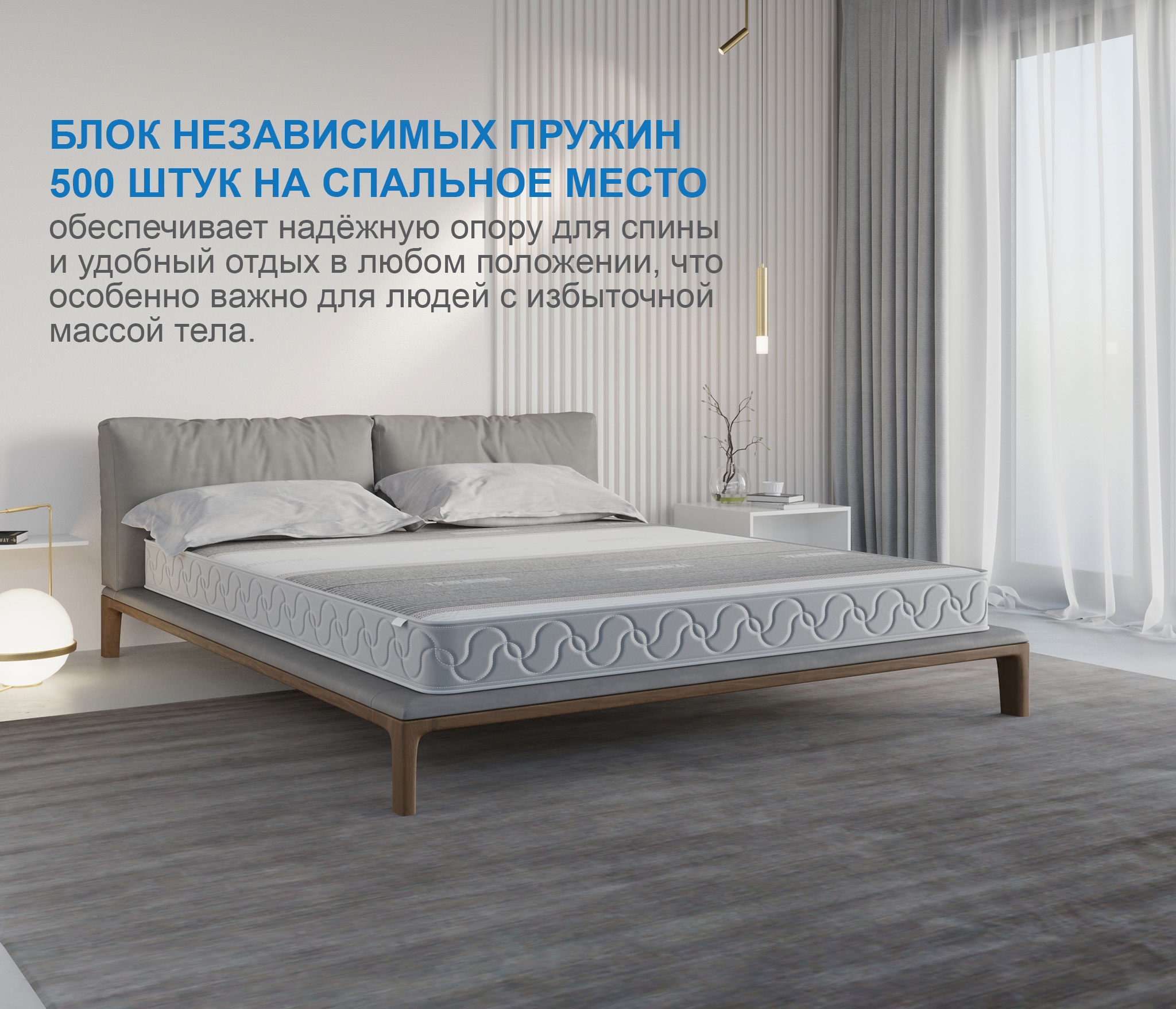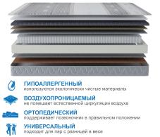 Матрас обладает разной жесткостью сторон. Вязкоаэластичная пена с эффектом микромассажа- уникальный материал, аналогичный материалам с памятью форм, но при этом создает более приятные ощущения за счет ячеек. Способствует улучшению кровообращения и предотвращает защемление мягких тканей. Один из самых востребованных материалов класса люкс. Обеспечивает циркуляцию воздуха внутри матраса, гипоаллергенен и устойчив к износу. Под ним находится слой латексированного сизаля, который отвечает за необходимую жесткость и распределение нагрузки на блок пружин, этот материал очень гибок и долговечен. Блок независимых пружин оказывает давление и поддержку только там где это необходимо, создавая при этом все условия для правильного расположения позвоночника во время сна. Обратная сторона матраса более жесткая, т.к. там используется латексированный кокосовый мат толщиной 2 см, но при этом для людей с весом ниже среднего матрас не будет казаться слишком жестким потому, что его чехол стегается на 15 мм пене с синтепоном плотностью 500 гр/м2. Обращаем ваше внимание на то, что любой матрас отвечает за правильность положения во время сна нижнего и среднего отделов позвоночника, а за правильность положения шейного отдела отвечает правильно подобранная ортопедическая подушка. Рекомендуем использование с защитным чехлом AquaStop.
