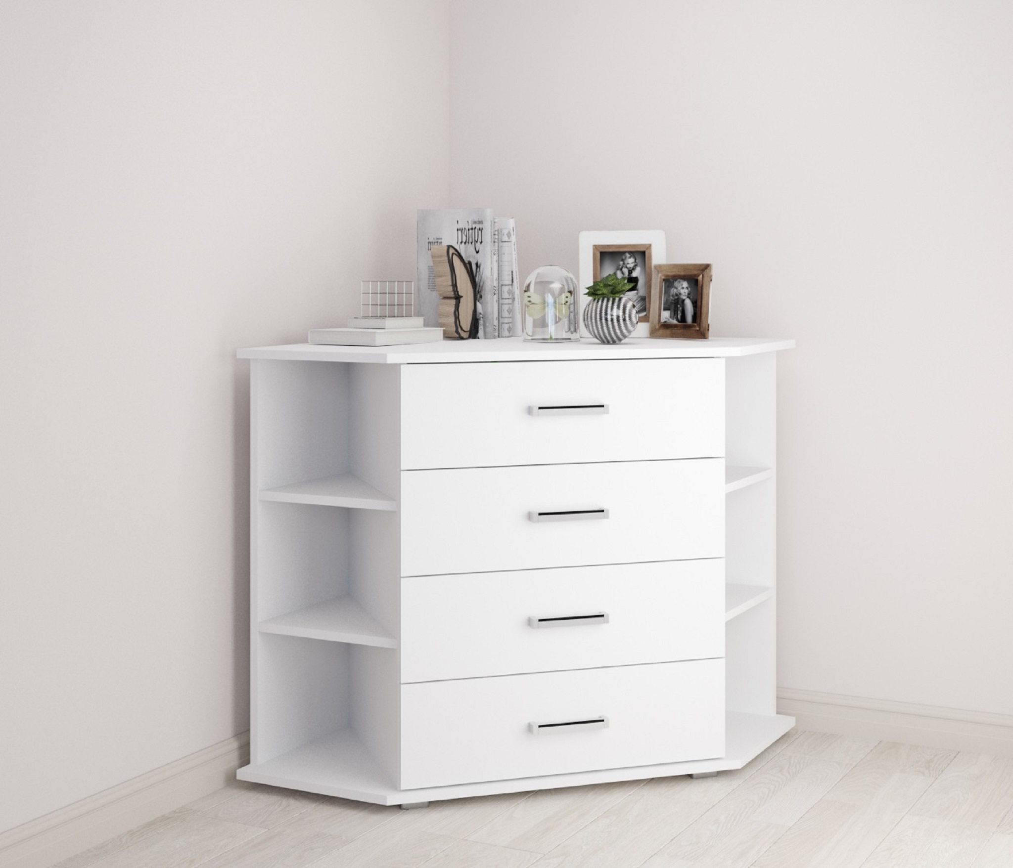 — Угловой комод с открытыми полками и выдвижными ящиками
