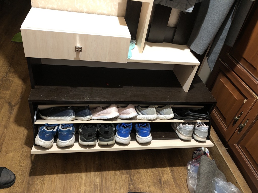 Так как на сайте только 1 фотография, было не понятно что за ящик внизу, но проблема даже не в его виде, на верхнюю секцию обувь залезает лишь боком, что сильно съедает пространство и очень неудобно (размер 38, 36 может ещё и влезет). Ящик большой, но полезного пространство занято процентов 60. Собирали сами, инструкция по сборке не очень понятная, что бы разобраться ушло время. На зеркале есть несколько непонятных точек, не критично, но заметно.