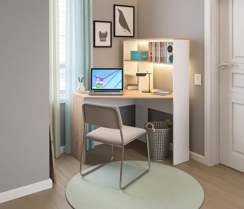 Стол Мамбо СБ-2986 – комфортное рабочее место. Благодаря продуманной конструкции и легкому минималистичному дизайну, стол не создает ощущение громоздкости в помещении. Габаритные размеры стола Мамбо – ширина 101 см, высота 138 см и глубина 93 см. Привычных для письменных столов тумб здесь нет, но есть вместительное отделение с полками над рабочей поверхностью. Конструкция позволяет размещать стол Мамбо в углу. Стол произведен из качественного современного ЛДСП, устойчивого к влаге. Внешняя отделка комбинированная. Корпус стола, рабочая поверхность и поверхность полок выполнены в цвете «Дуб Сонома», а торцевые поверхности в белом цвете.