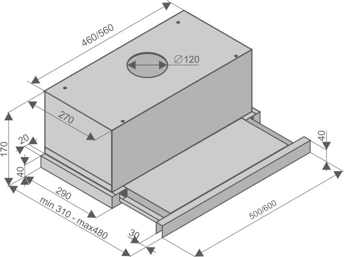 Особенности: Вытяжка снабжена двумя плоскими итальянскими моторами, которую обеспечивают высокую производительность.. Выдвижна панель имеет такой же размер, что и основная стационарная панель, в результате чего покрывает всю рабочую зону. Широкий выбор цветовых исполнений.