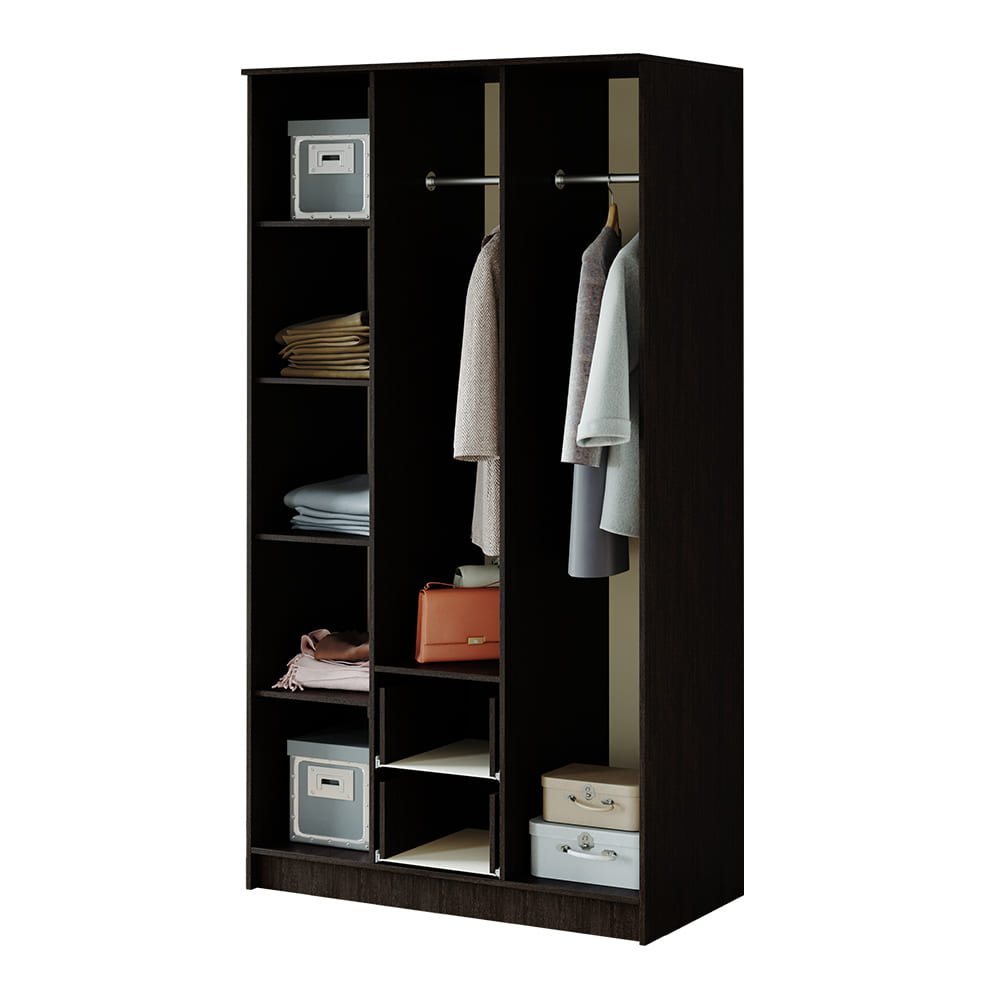Внутренняя комплектация состоит из отделений с хромированными штангами и зоны с полками для хранения трикотажа или белья.