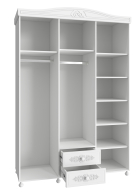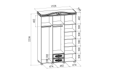 Шкаф разделен на три секции. Первая (слева-направо) секция шириной 510 мм имеет верхнюю полку и платяное отделение с трубой для вешалок.