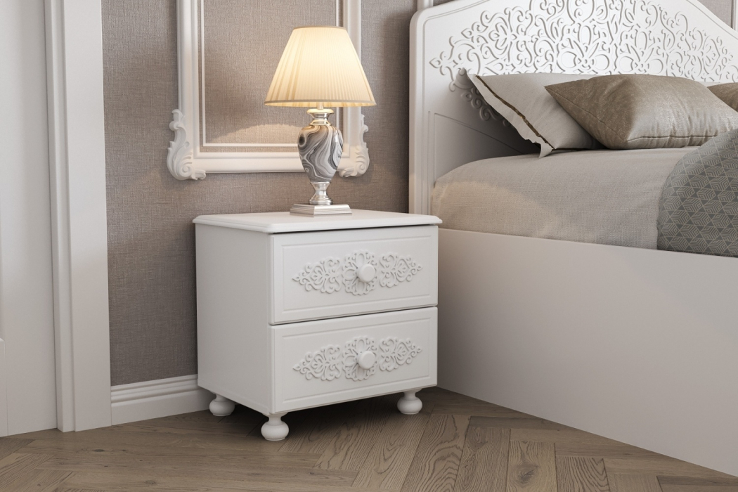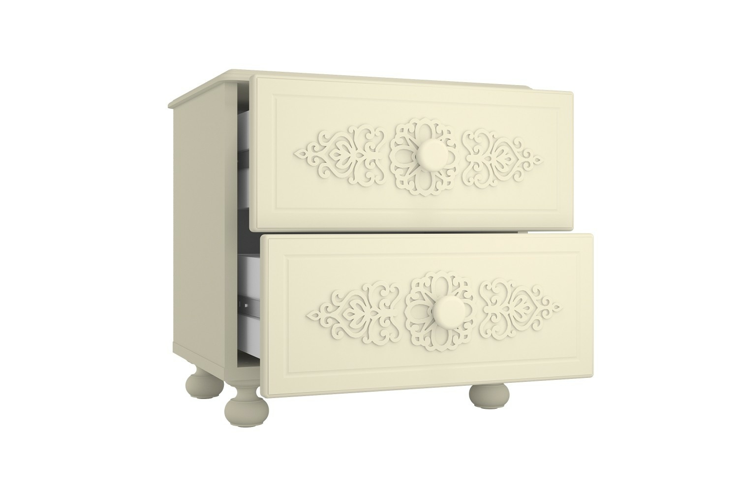 Прикроватная тумба с двумя выдвижными ящиками. Высота боковых стенок каждого ящика 120 мм, ширина ящика 340 мм, глубина 300мм. Ящики установлены на телескопических направляющих полного выдвижени