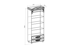 Стеллаж с открытыми полками и двумя выдвижными ящиками. Высота полок 323 мм. Высота верхней полки — 516 мм. Высота боковых стенок каждого ящика 130 мм, ширина ящика 708 мм, глубина 350 мм. Ящики установлены на телескопических направляющих полного выдвижения.