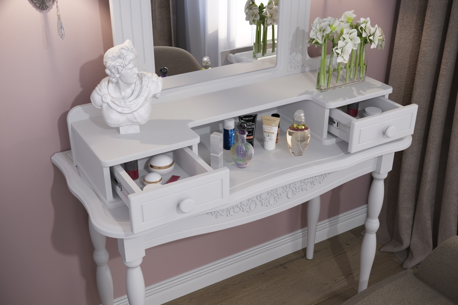 На столик могут быть поставлены (прикручены) полка АС-37 или полка с зеркалом АС-38. Такие комплекты отлично подходят как для прихожей, так и для спальни.