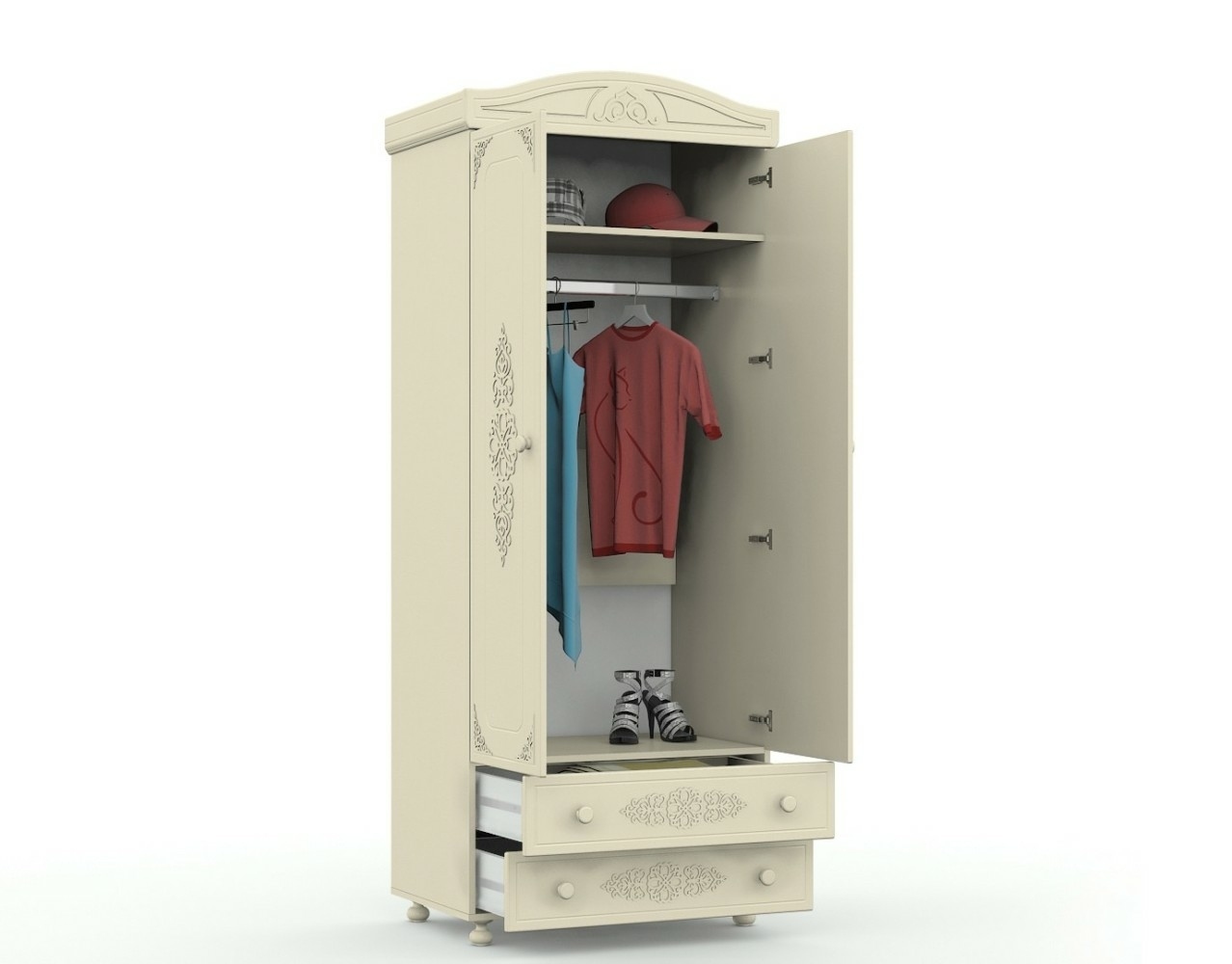 Платяной шкаф с двумя дверцами и двумя выдвижными ящиками. Высота боковых стенок каждого ящика 130 мм, ширина ящика 708 мм, глубина 450 мм. Ящики установлены на телескопических направляющих полного выдвижения. В верхней части шкафа расположена полка высотой 260 мм. Под полкой расположена штанга для плечиков.