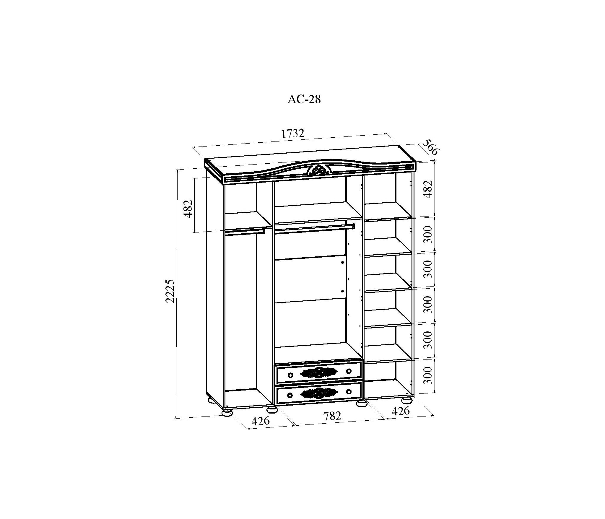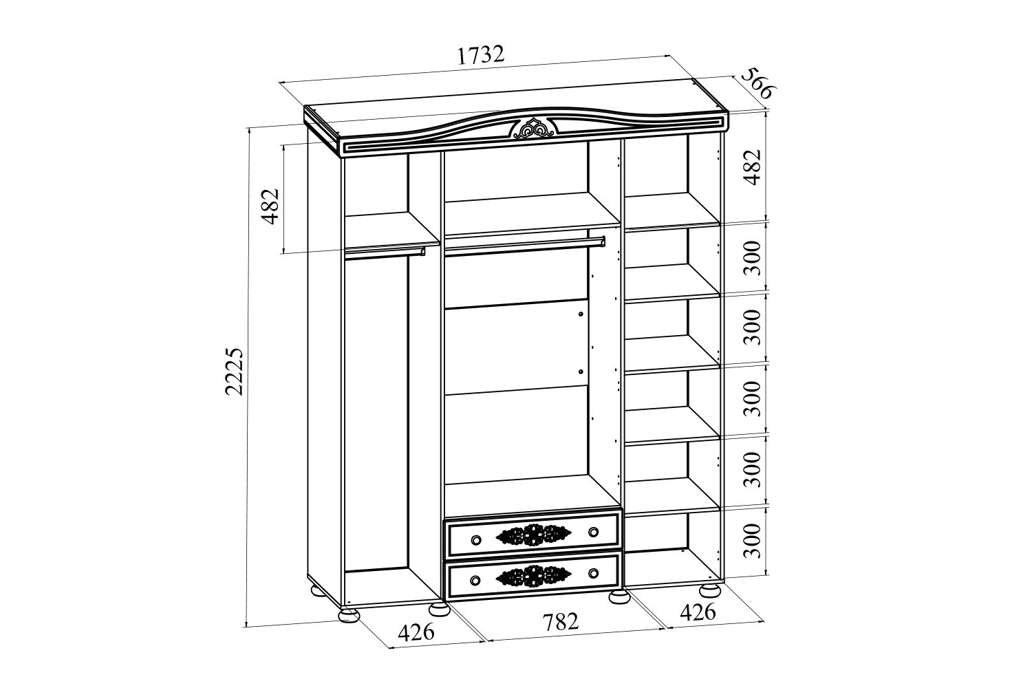 Шкаф разделен на три секции. Первая (слева-направо) секция шириной 510 мм имеет верхнюю полку и платяное отделение с трубой для вешалок.