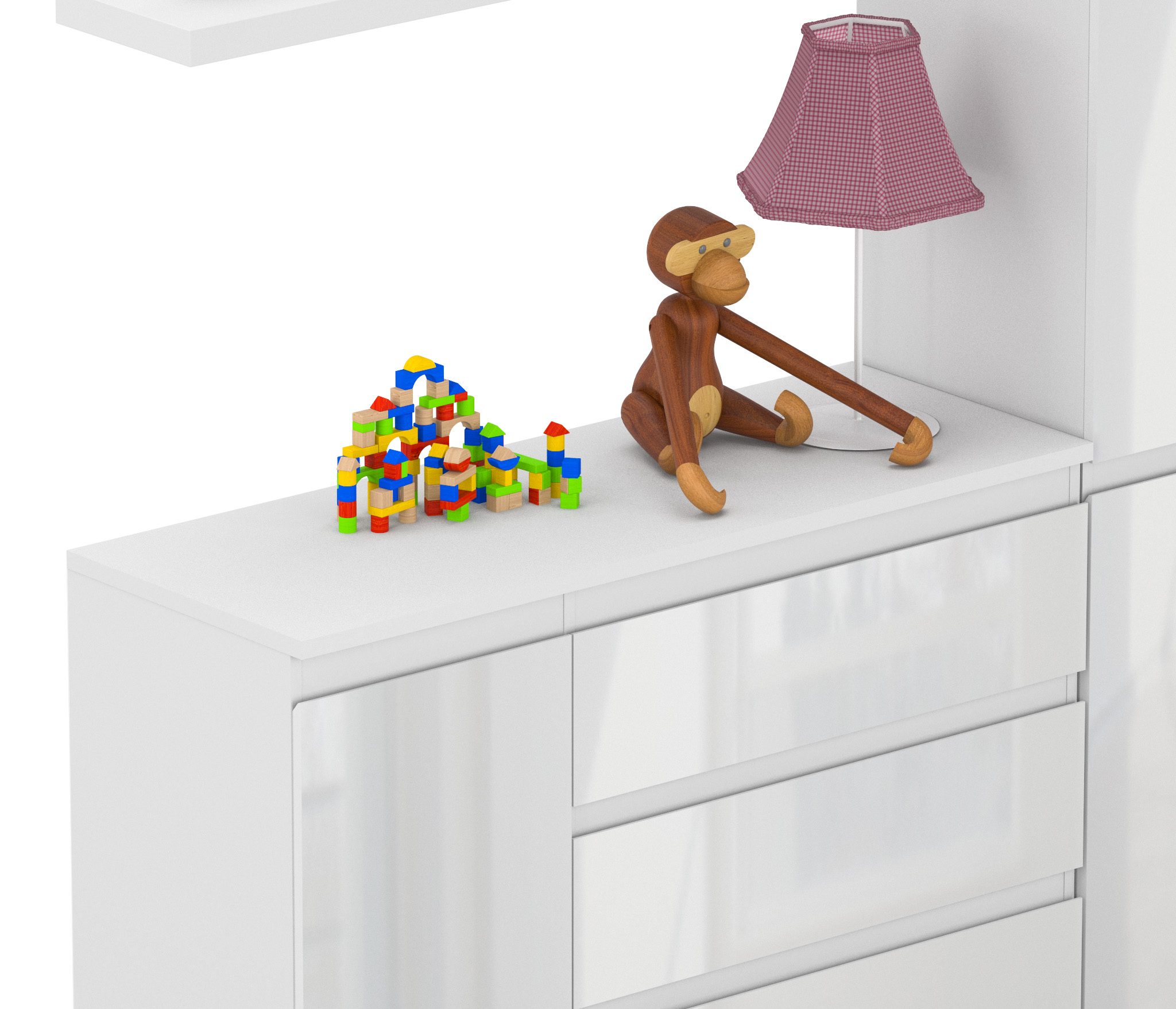 Размеры комода – ширина 120 см, высота 86 см и глубина 44 см. Под одной столешницей объединены три выдвижных ящиков и тумба. Тумба оснащена двумя довольно высокими полками. Комод Медея выполнен из прочного и влагоустойчивого материала. Все выдвижные механизмы прочные и имеют солидный ресурс. Комод выполнен в лаконичном дизайне, белое глянцевое покрытие фасадов позволяет смотреться этому предмету мебели стильно и не громоздко.