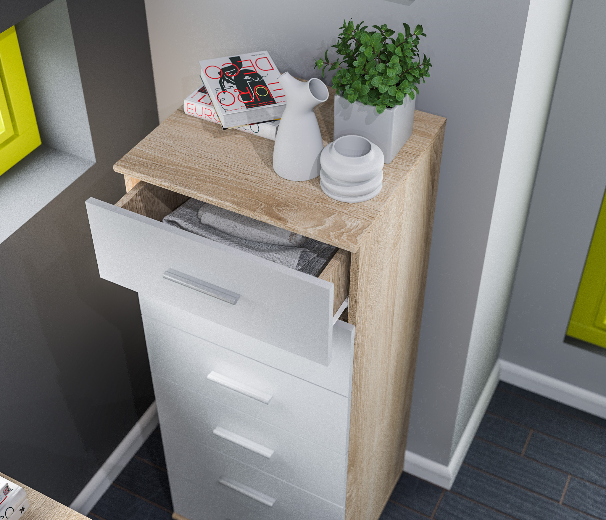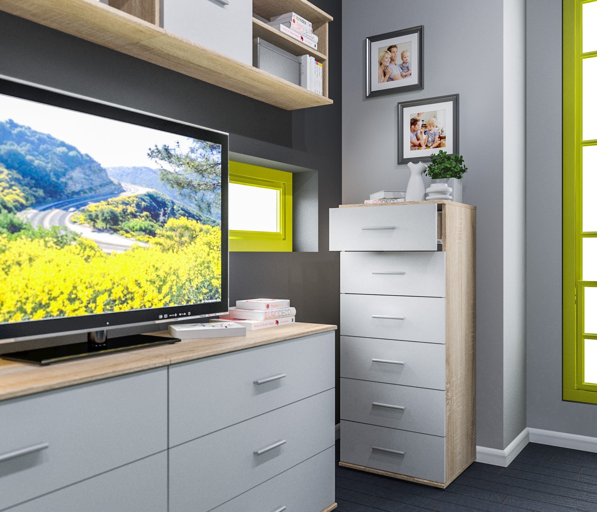 Выполнен комод Мамбо из современного материала. Основной цвет отделки -- «Дуб Сонома», а фасады выдвижных ящиков имеют белое матовое покрытие.