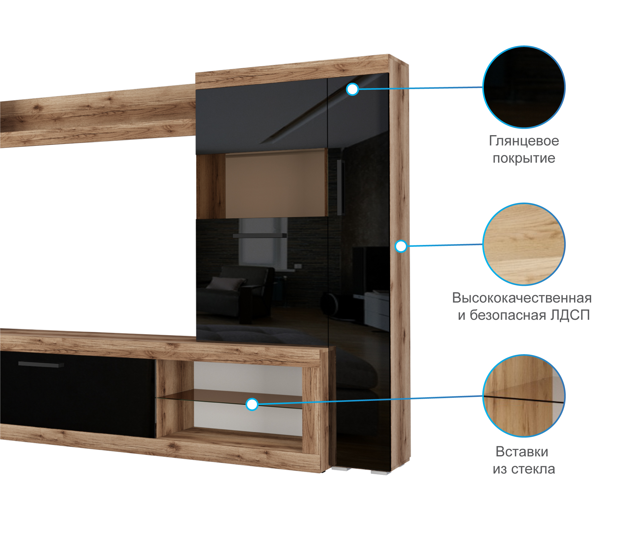 Стекло, глянцевые фасады, С полками, С ТВ тумбой