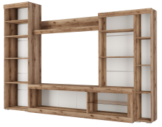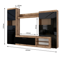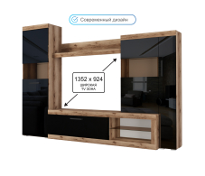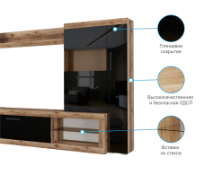 Гостиная Бастон является практичным вариантом для обустройства стильной комнаты. Открытые ниши и закрытые отделения предоставят достаточно места для размещения абсолютно всех вещей: посуды, книг и предметов декора. Для телевизора предназначена широкая зона по центру. Сочетание корпуса изделия в древесных оттенках и глянцевых фасадов со вставками из стекла делают мебель яркой и современной.