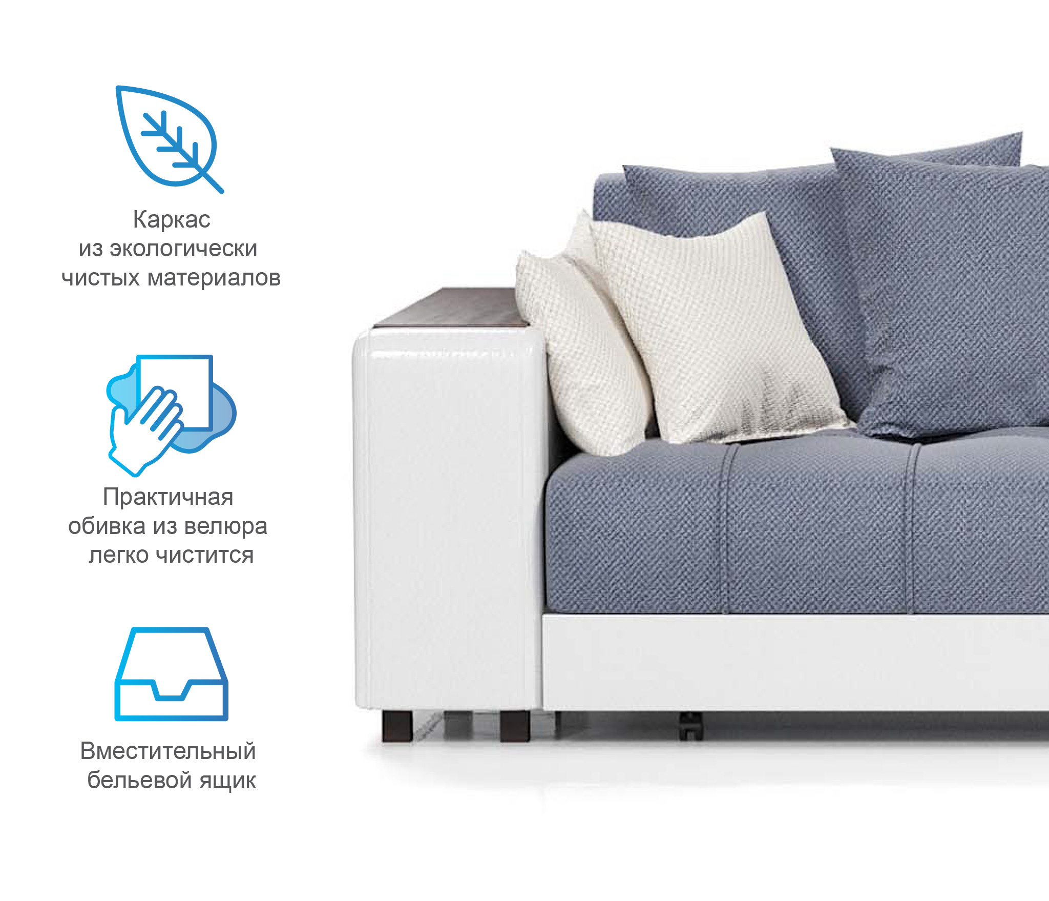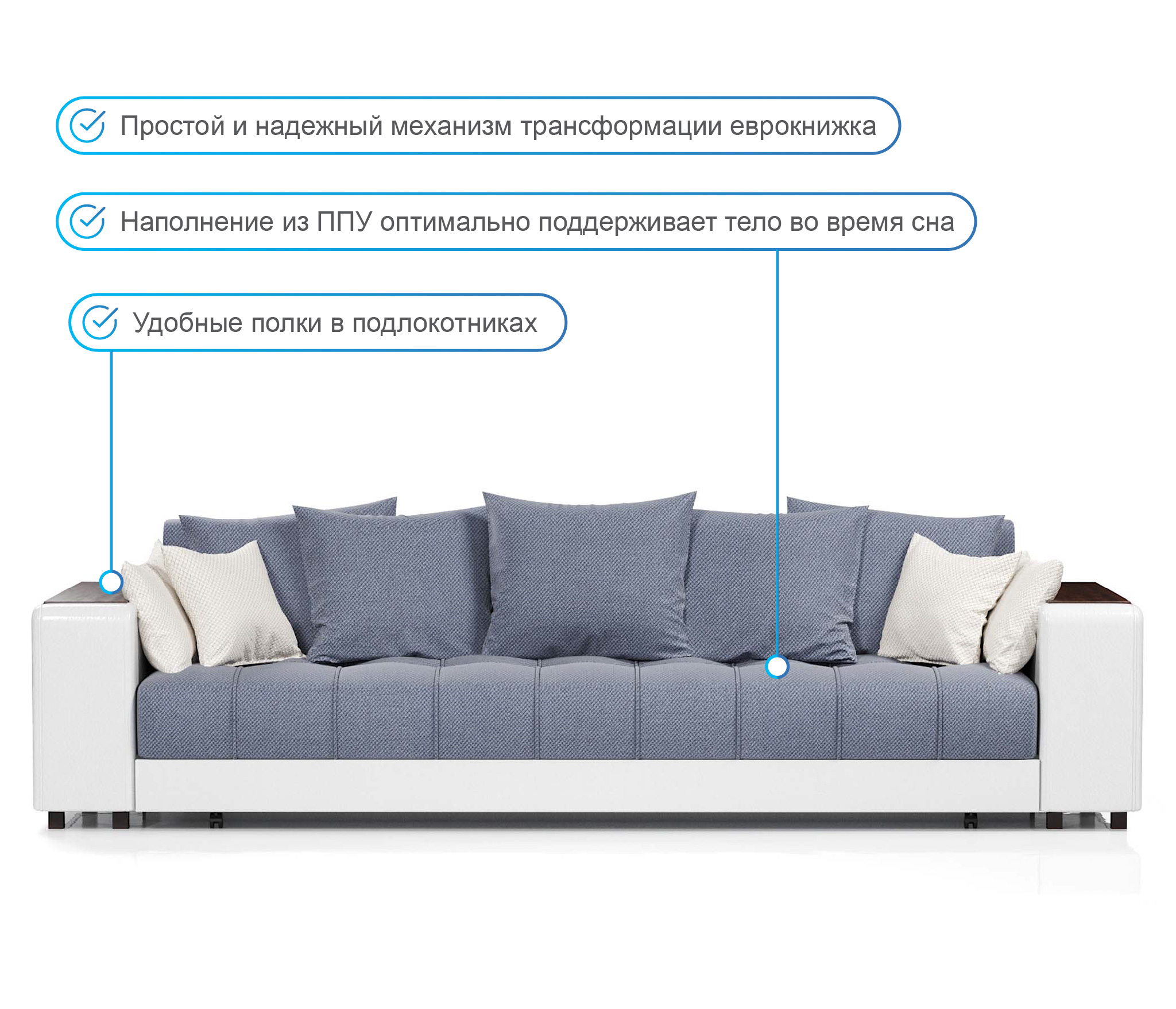 Прямой диван Дубай это отличный выбор для тех, кто планирует создать уют в своей квартире. Модель имеет выдержанный дизайн без элементов, которые перегружают её. С каждой стороны в подлокотниках установлены полки, куда вы сможете складывать различные мелочи, пульт итд.
