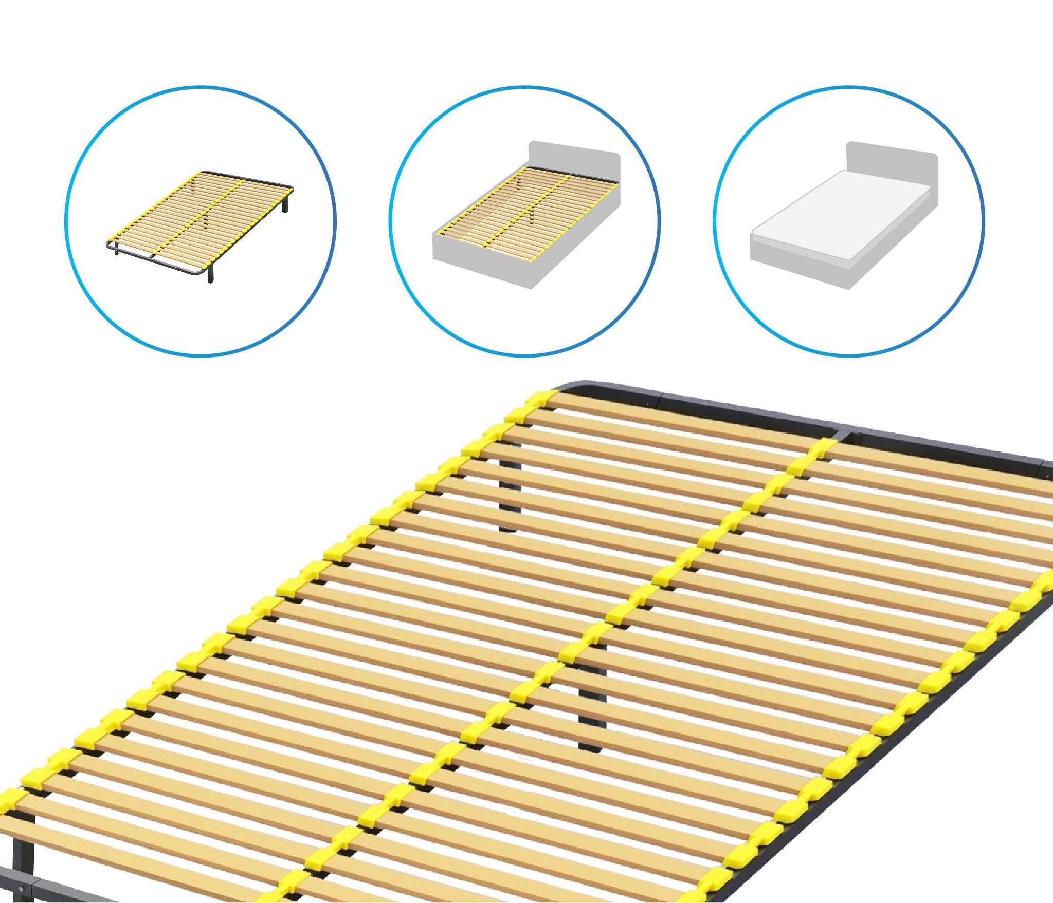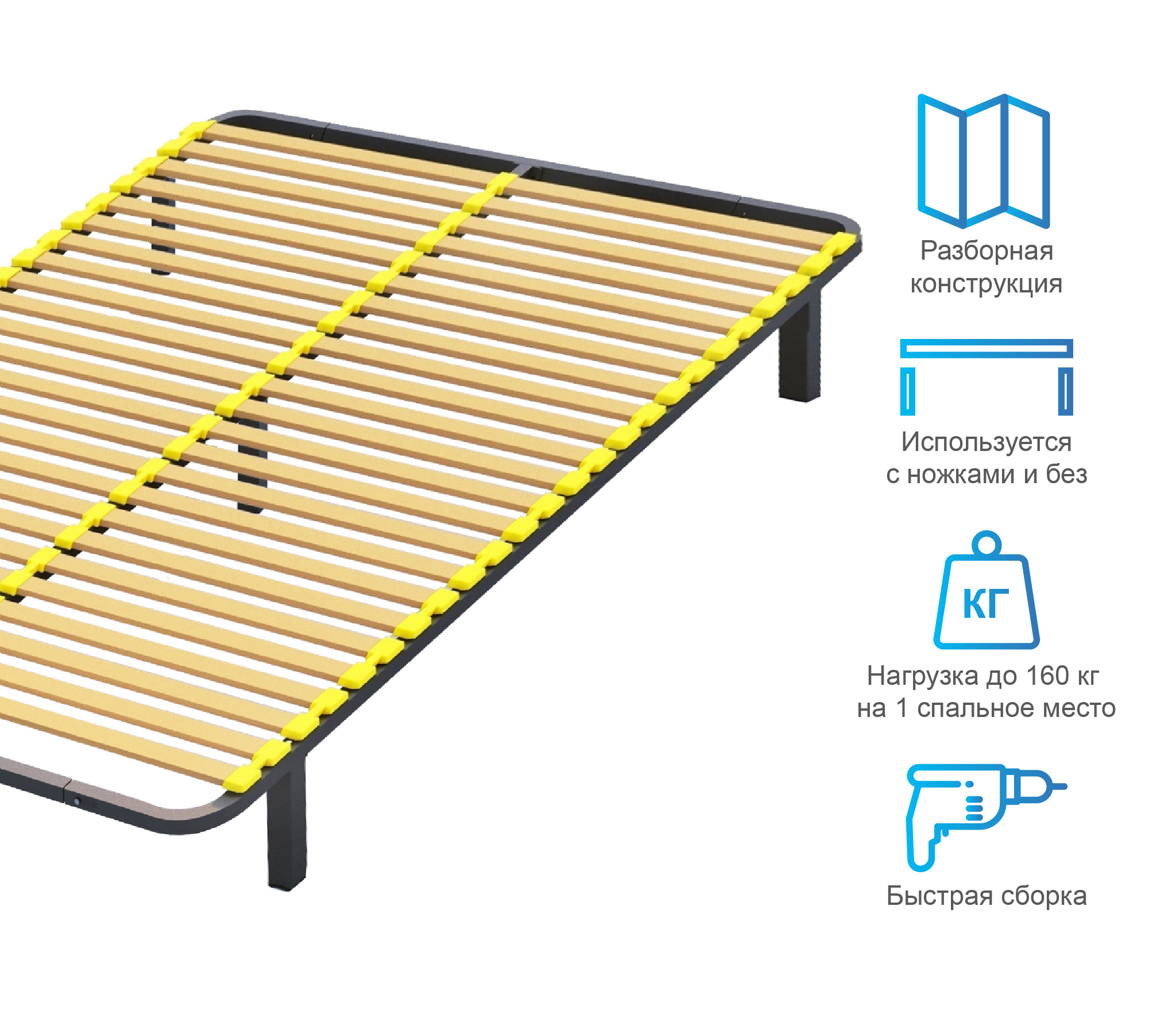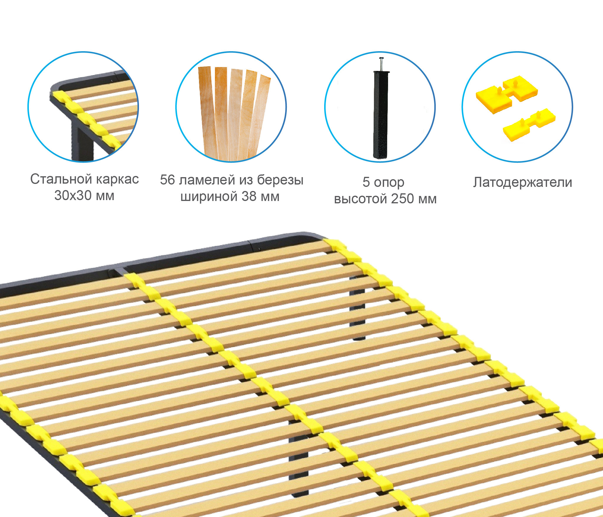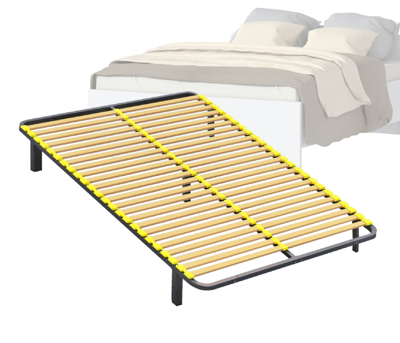 Разборное кроватное основание выполнено из металлической трубы квадратного сечения (30х30мм) и упругих гнуто-клееных берёзовых ламелей шириной 38 мм, толщиной 8 мм.