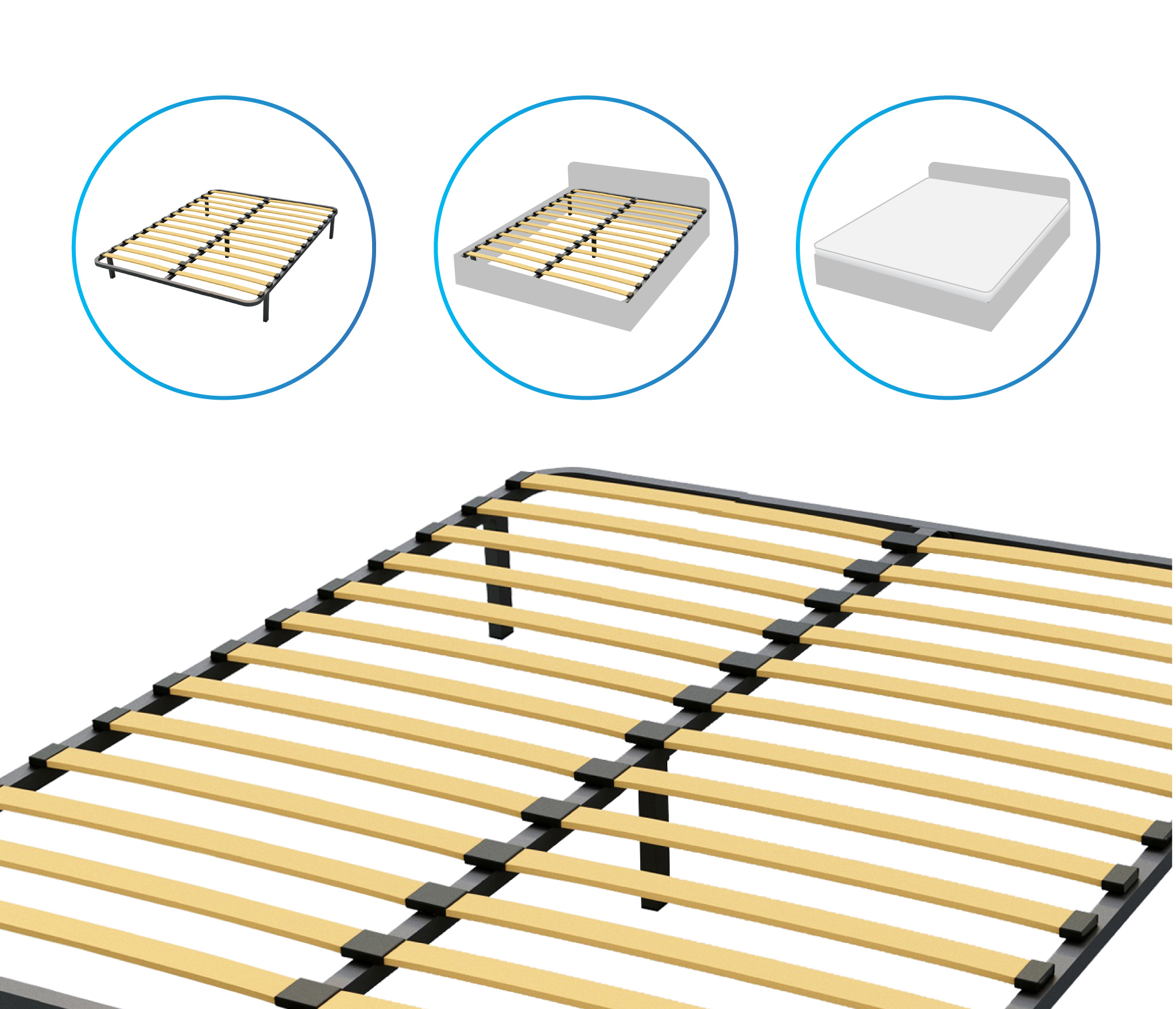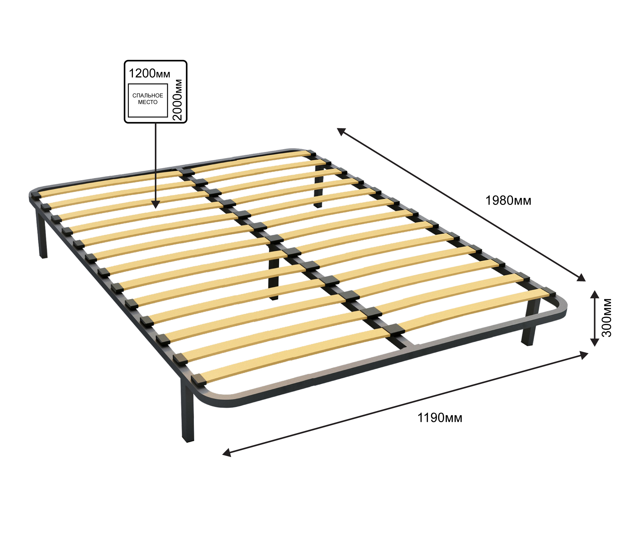 Разборное кроватное основание выполнено из металлической трубы квадратного сечения (30х30мм) и упругих гнуто-клееных берёзовых ламелей шириной 53 мм, толщиной 8 мм.