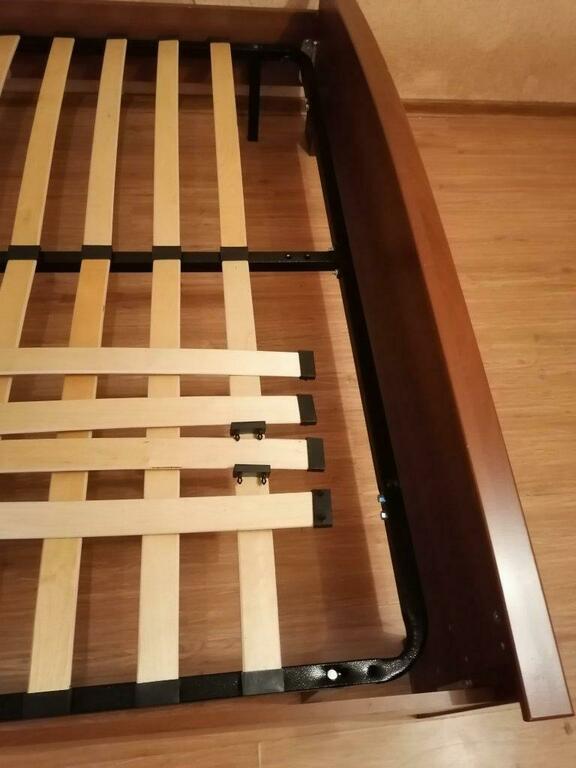Разборное кроватное основание выполнено из металлической трубы квадратного сечения (30х30мм) и упругих гнуто-клееных берёзовых ламелей шириной 53 мм, толщиной 8 мм.