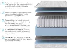 В основе данной модели - блок независимых пружин - TFK (250 пружин на кв.м.), где каждая пружина заключена в отдельный чехол из спанбонда. Внешние слои наполнителей матраса отделены защитным слоем термовойлока, который защищает материал от губительного воздействия, связанного с работой пружинного блока. Такая конструкция предотвращает появление эффекта гамака, а также способна справится с разницей в весе спящих - более 25 кг.