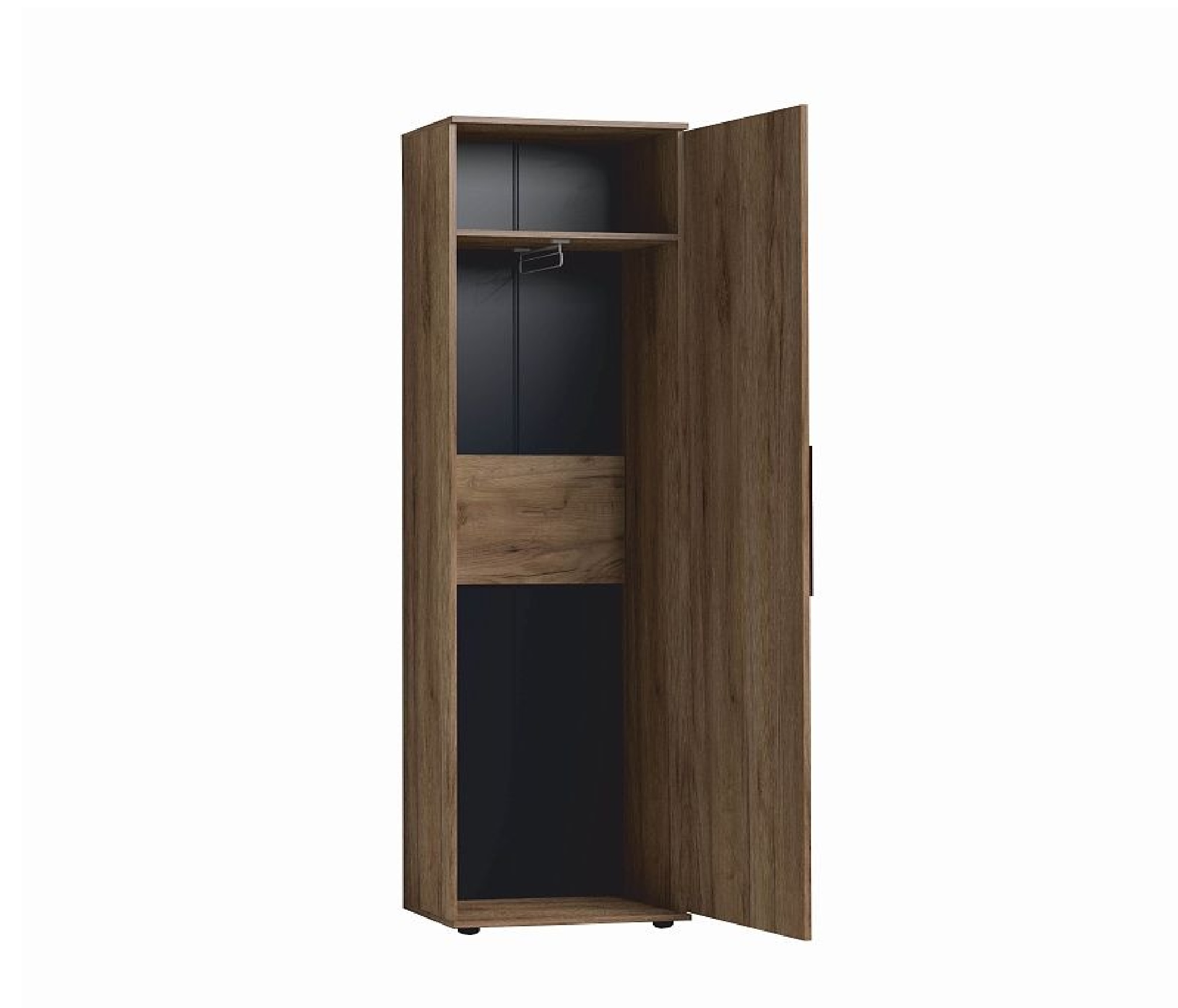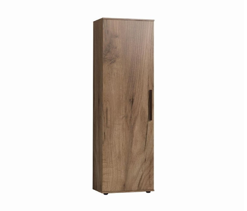 Распашной шкаф в декоре Дуб Табачный комплектуется штангой для одежды и полкой. Выдвижная штанга выдерживает нагрузку до 10 кг. Для удобства использования шкаф может собираться как на левую, так и на правую сторону.