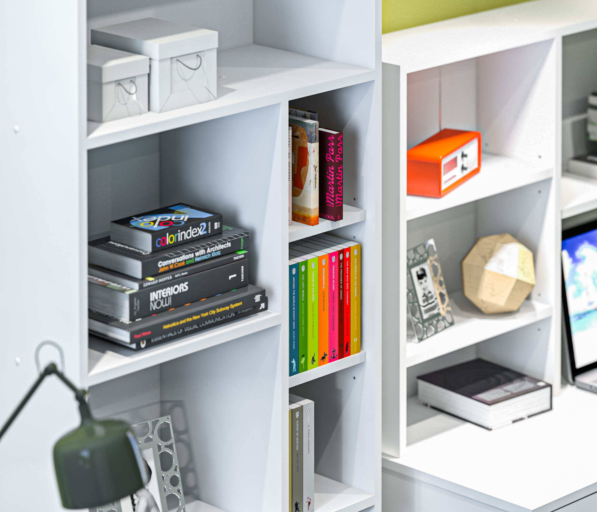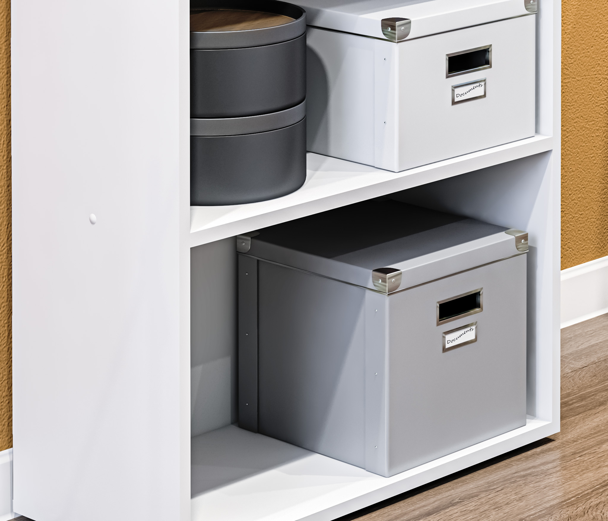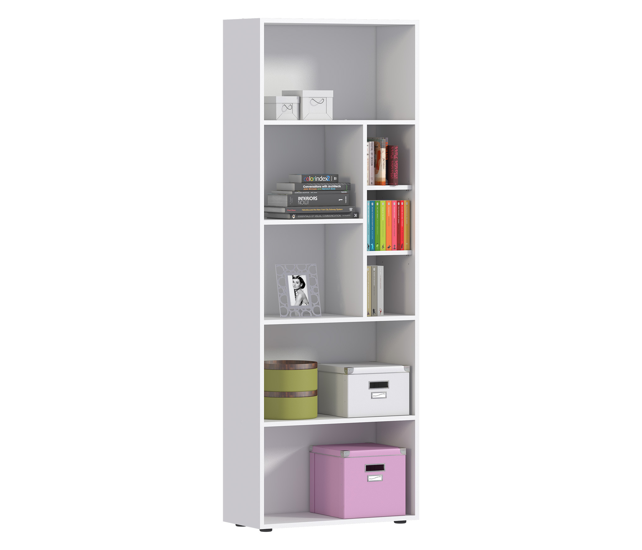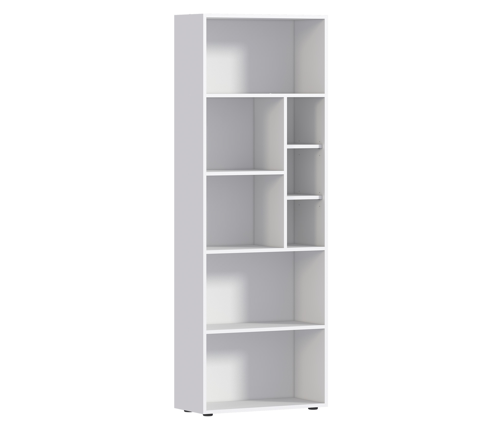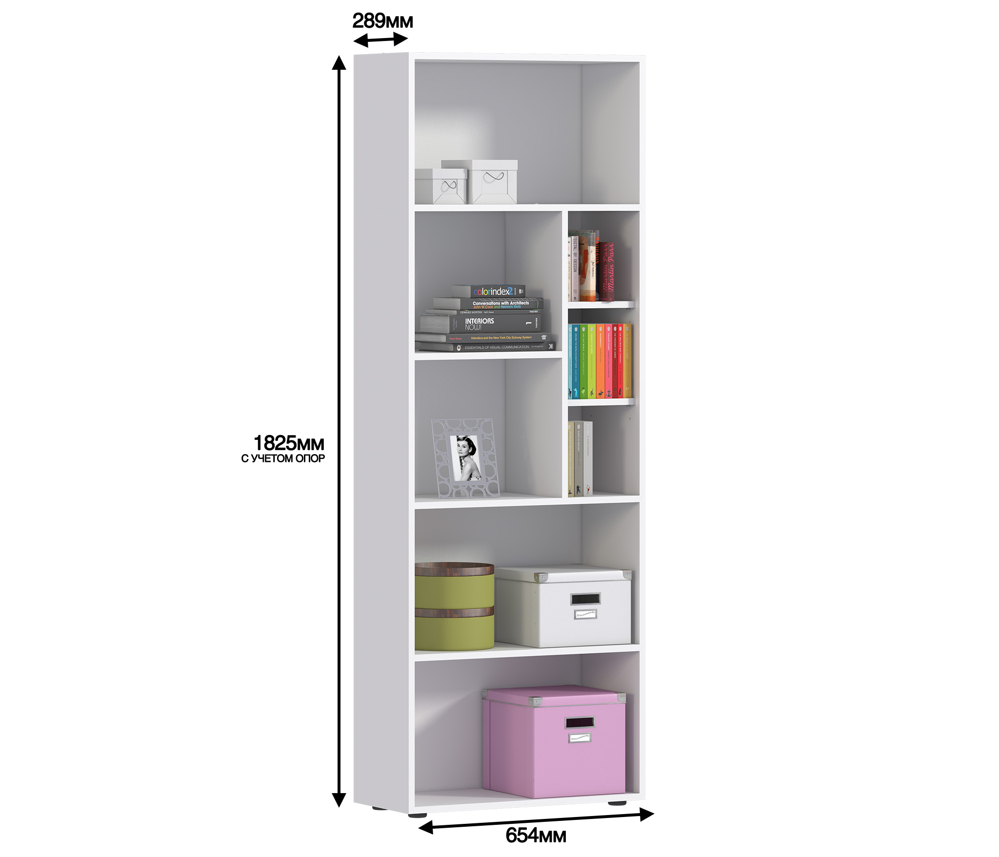Габаритные размеры – ширина 65 см, высота 182 см и глубина 28 см. Конструкция стеллажа представляет собой ряд открытых полок на пяти уровнях. Две нижних и верхняя полки одинакового размера. Две средних полки поделены на секции. Выполнен стеллаж из современного прочного материала ЛДСП. Материал отделки чисто белого цвета, устойчив к влаге и воздействию бытовых моющих средств. Стеллаж оснащен протекторами или «лапками», которые не дают повредить пол. Для обеспечения максимальной устойчивости стеллаж надежно крепится к стене. Все необходимые крепёжные элементы входят в комплект.
