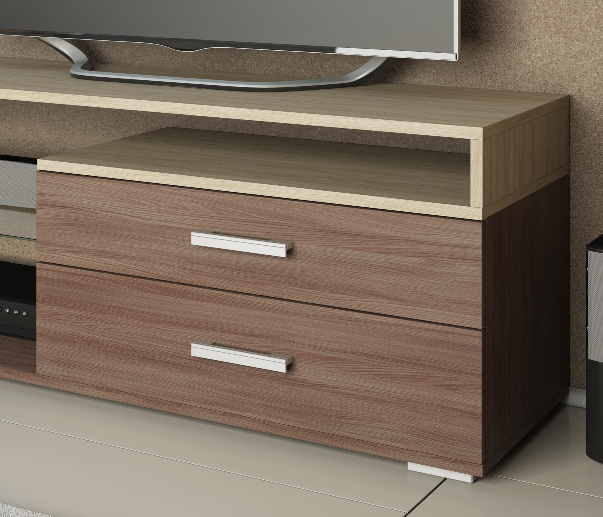 Большая ТВ-тумба имеет широкую столешницу, которая подходит для телевизора практически любой диагонали. Открытые полочки подойдут для игровых приставок или видеоплееров, а два вместительных ящика позволят разместить сопутствующие аксессуары.