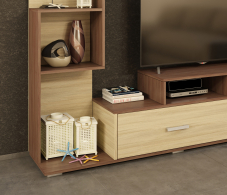 Конструкцией предусмотрен шкаф с полками для хранения одежды, постельного белья и других вещей. В основании располагаются открытые ниши и закрытые отделения. По периметру стенка имеет полки разных размеров для книг, фотографий, предметов интерьера и других мелочей.