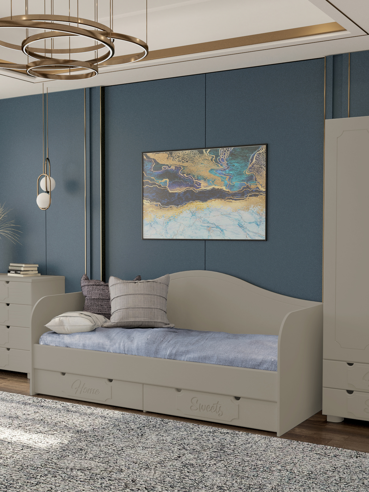 Материал корпуса/фасада: ЛДСП/МДФ. Цвет корпуса/фасада: белое дерево. Размеры модуля (ш/г/в) в мм: 2038х855х950. Кровать идет в комплекте с бортиком. Защитная боковая панель (бортик) 410х1400 мм, крепится к любой боковой стенке. Основание кровати - фанера. Ламели не предусмотрены конструктивом. Размер ящиков в мм: 939х750х174.