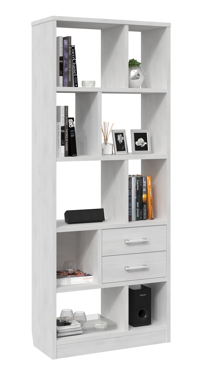 Очень приличный стеллаж. Долго искала подобный с полками и выдвижными ящиками в таком цвете и таких габаритов, он полностью соответствует картинке в карточке товара, что заказал, то и пришло, это плюс, никаких сюрпризов. Изначально его не было в наличии, но заказ все равно оформился и его выполнили. Качество комплектующих стеллажа очень достойное. 99% элементов имеют толщину больше обычной дсп почти в 2 раза, поэтому стеллаж очень тяжёлый и в собранном и в разобранном виде (такая большая толщина немного удивила, но скорее приятно). Запакован был в несколько коробок. Упаковка не ахти какая, но все пришло целое, без сколов и царапин, возможно мне просто повезло, или продавец очень хорошо информирует службу доставки об аккуратности. Сзади внизу у стеллажа имеется вырез под стандартный плинтус, так что его можно придвинуть вплотную к стене. Так же у него имеются регулируемые опоры, если полы кривые это большой плюс. Стеллаж собирается ровно, без перекосов, не требуется переделывать заводскую разметку и отверстия, все сделано точно. Для меня единственный минус - немого криво задвигаются выдвижные ящики, грешу что лицевые элементы немного разные, или все таки разметка чуть-чуть не там (или и то и то), потому что щели получаются разные. Это не сильно заметно, но все же это так. Фурнитура (ручки на ящиках) из полого пластика, визуально ничего, на ощупь слегка дешевит и думаю что скоро я заменю её на другую, более качественную. В общем и целом, это отличная покупка.