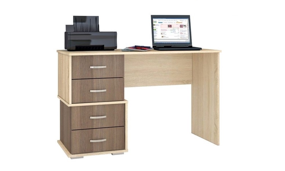 Ищете недорогой письменный стол необычной формы? Обратите внимание на модель Сити-2. Несмотря на популярный декор дуб крафт золотой/белый, стол отличается от аналогов конструкцией встроенной тумбы с ящиками. Вы сможете организовать не только функциональное и комфортное для ежедневной работы, но и визуально привлекательное рабочее место. Четыре выдвижных ящика оснащены роликовыми направляющими. Ручки пластиковые цвета "металлик".