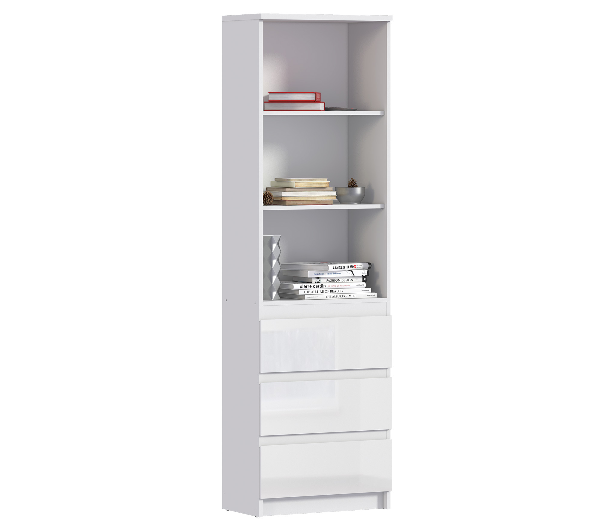 Габаритные размеры – ширина 60 см, высота 200 см и глубина 35 см. Конструктивно стеллаж состоит из трех вместительных открытых полок и расположенных под ними трех закрытых выдвижных ящиков.