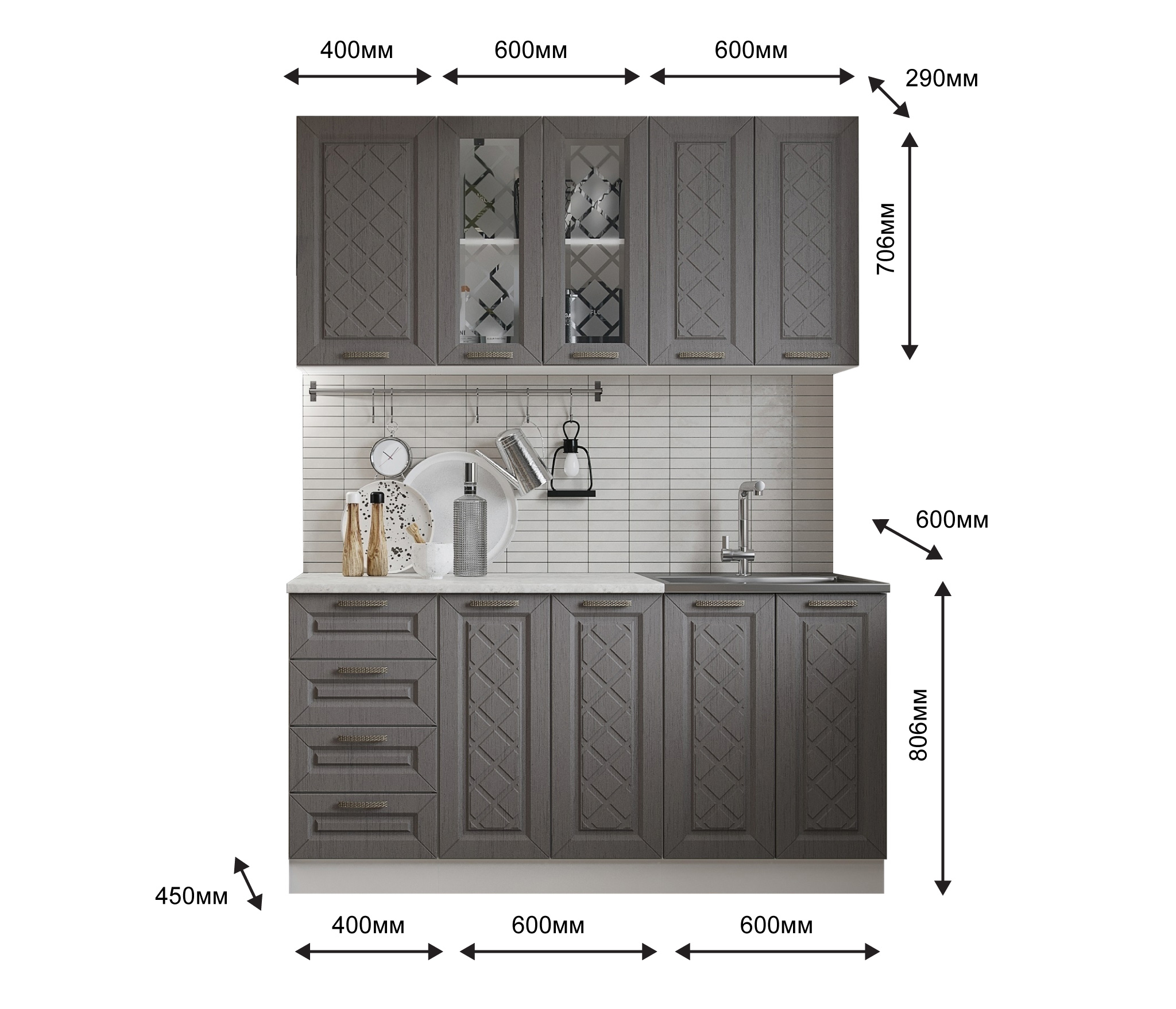 Высота нижних модулей указана с учетом столешницы, кроме модуля М600 под мойку. Мойка в комплект не входит и приобретается отдельно.
