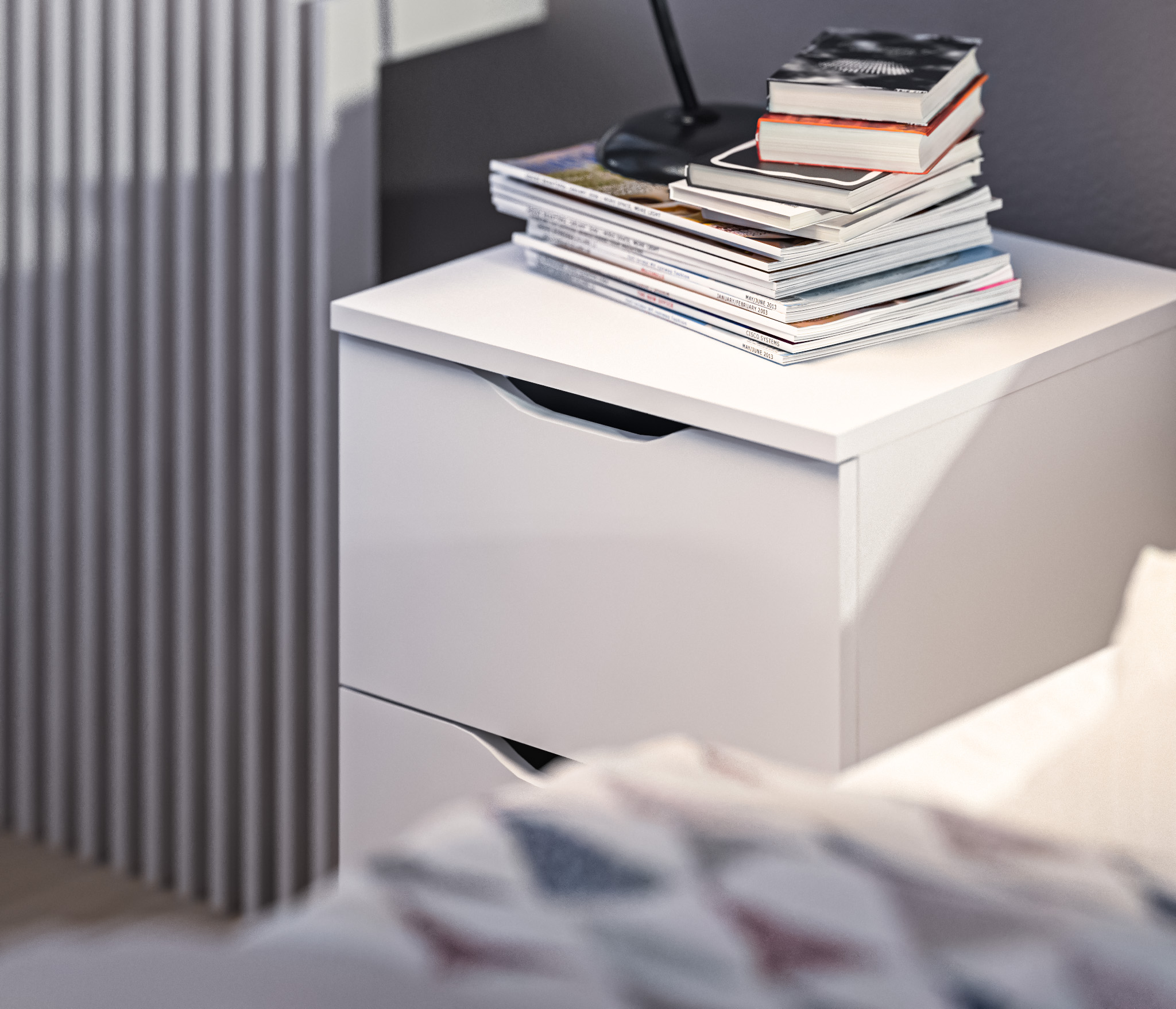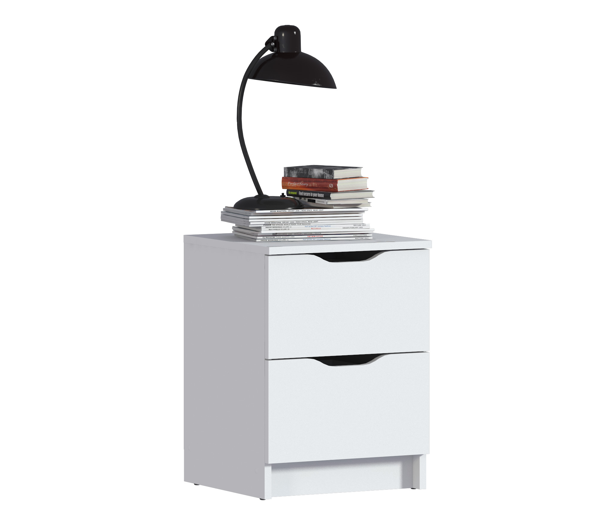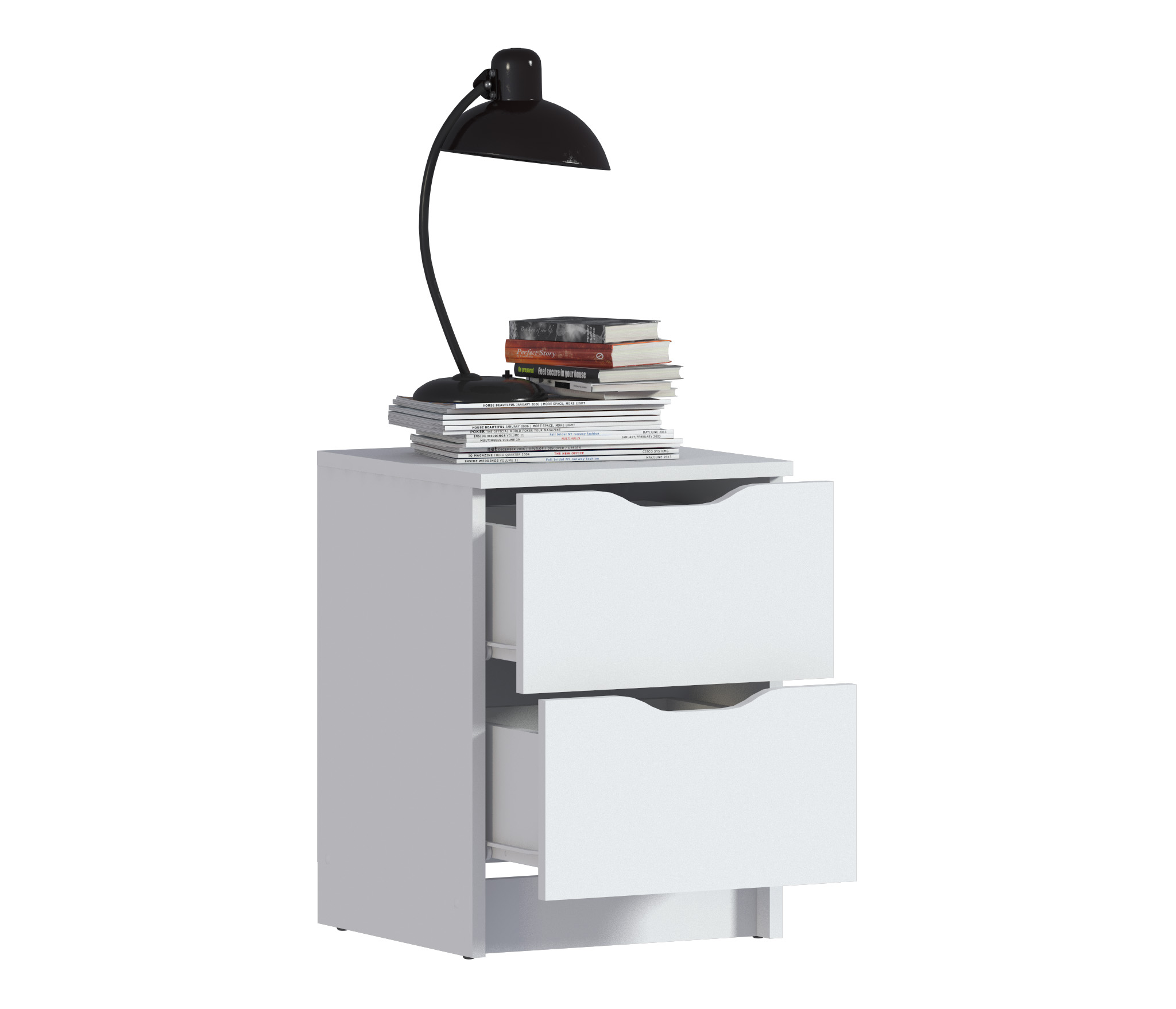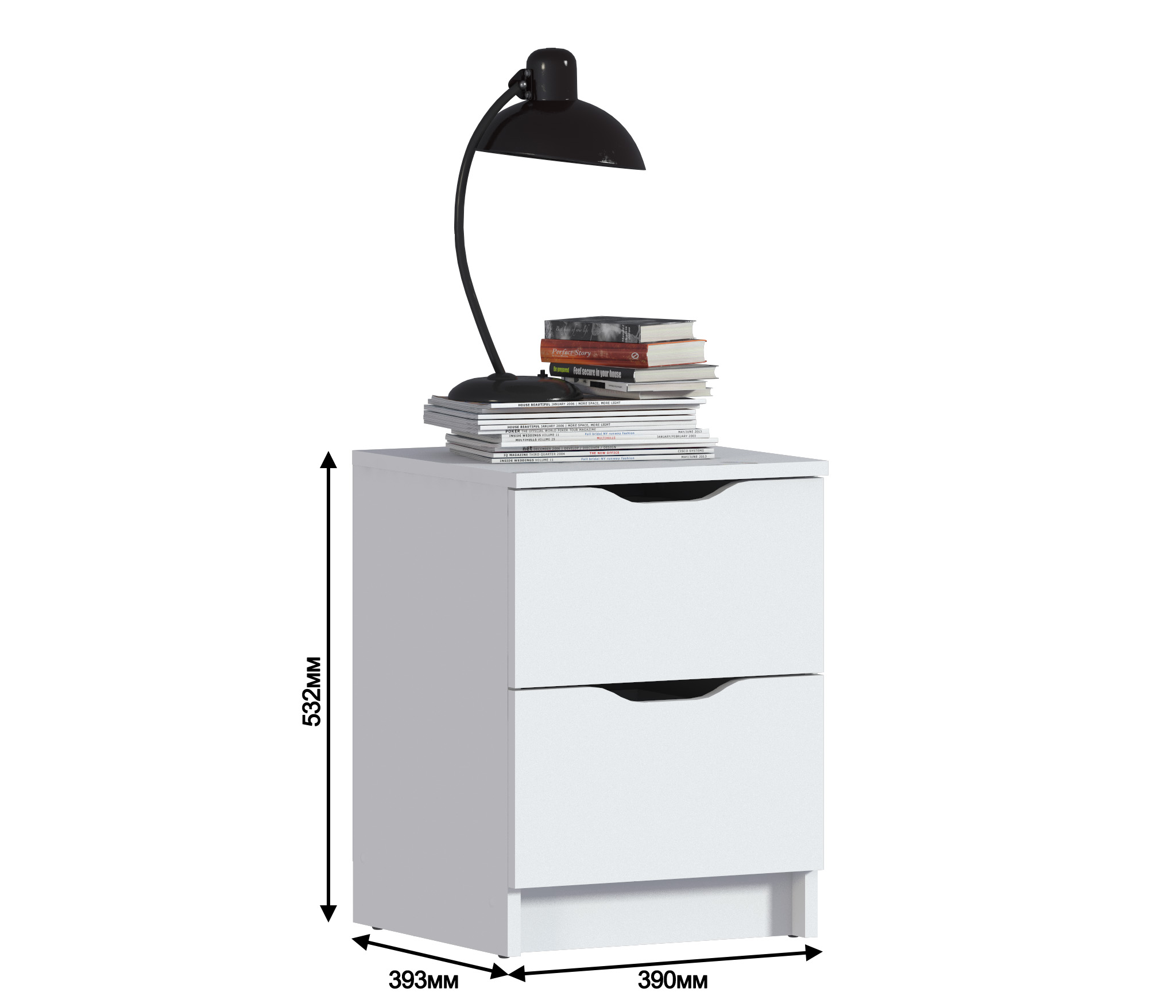 При компактных габаритных размерах – ширина 39 см, высота 53 см и глубина 39 см, тумба довольно вместительная. Под столешницей расположены два выдвижных ящика с прорезными ручками, где можно хранить вещи.