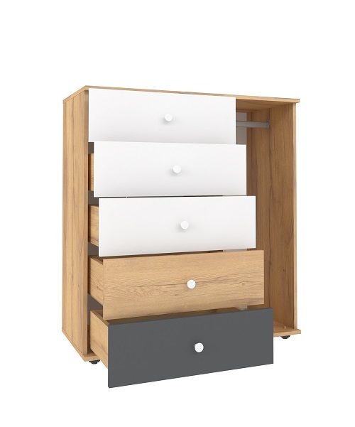 Комод из коллекции «Лойс» создан с учетом вкуса и потребностей Вашего ребенка! Личные вещи и белье поместятся в 5-ти вместительных ящиках на шариковых направляющих. Открытая ниша имеет просторную штангу, на которой ребенок разместит школьную форму и деликатную одежду на плечиках. Благодаря необычной конструкции комода Вашему чаду будет проще соблюдать порядок в детской без лишних хлопот.
