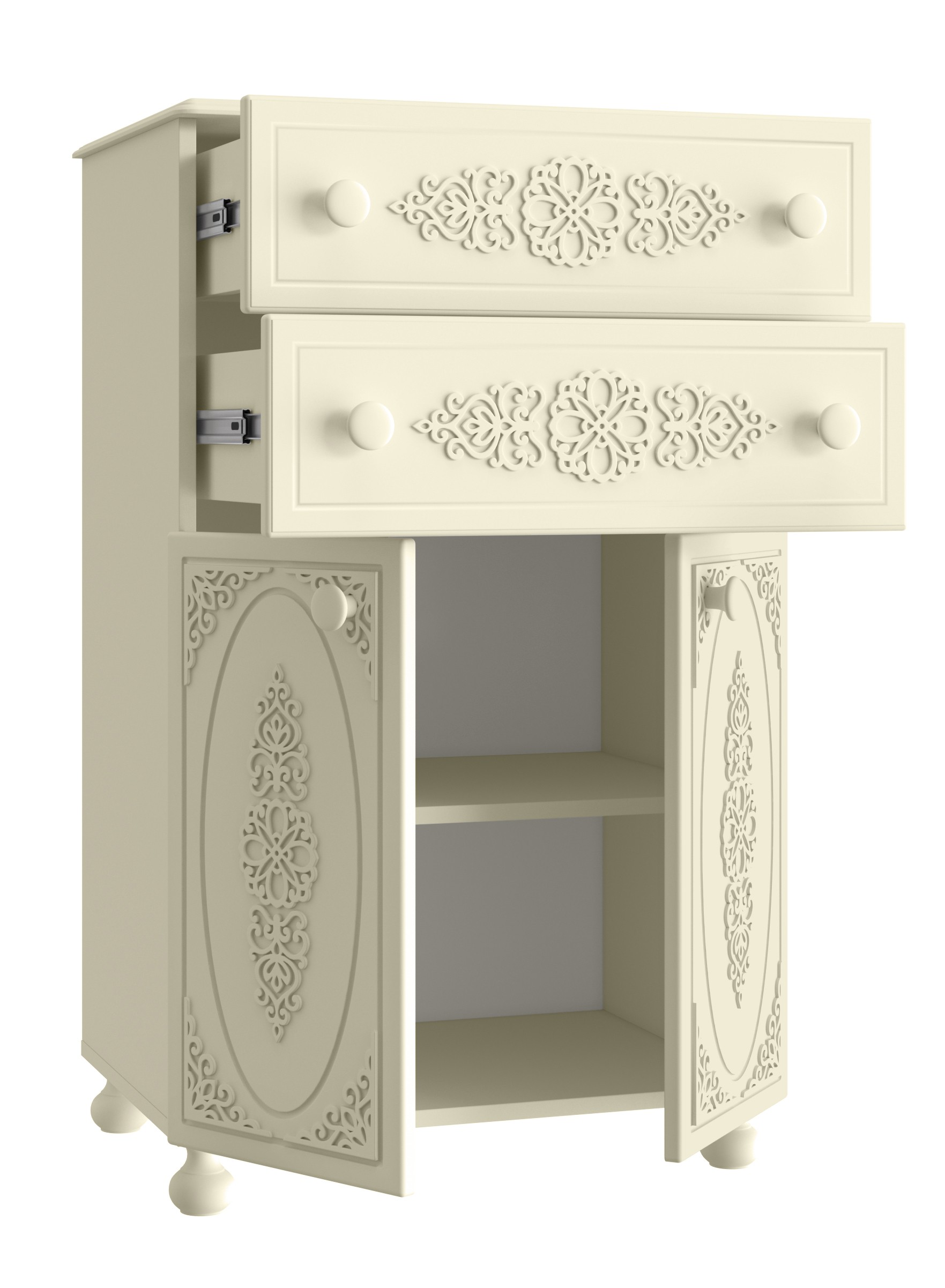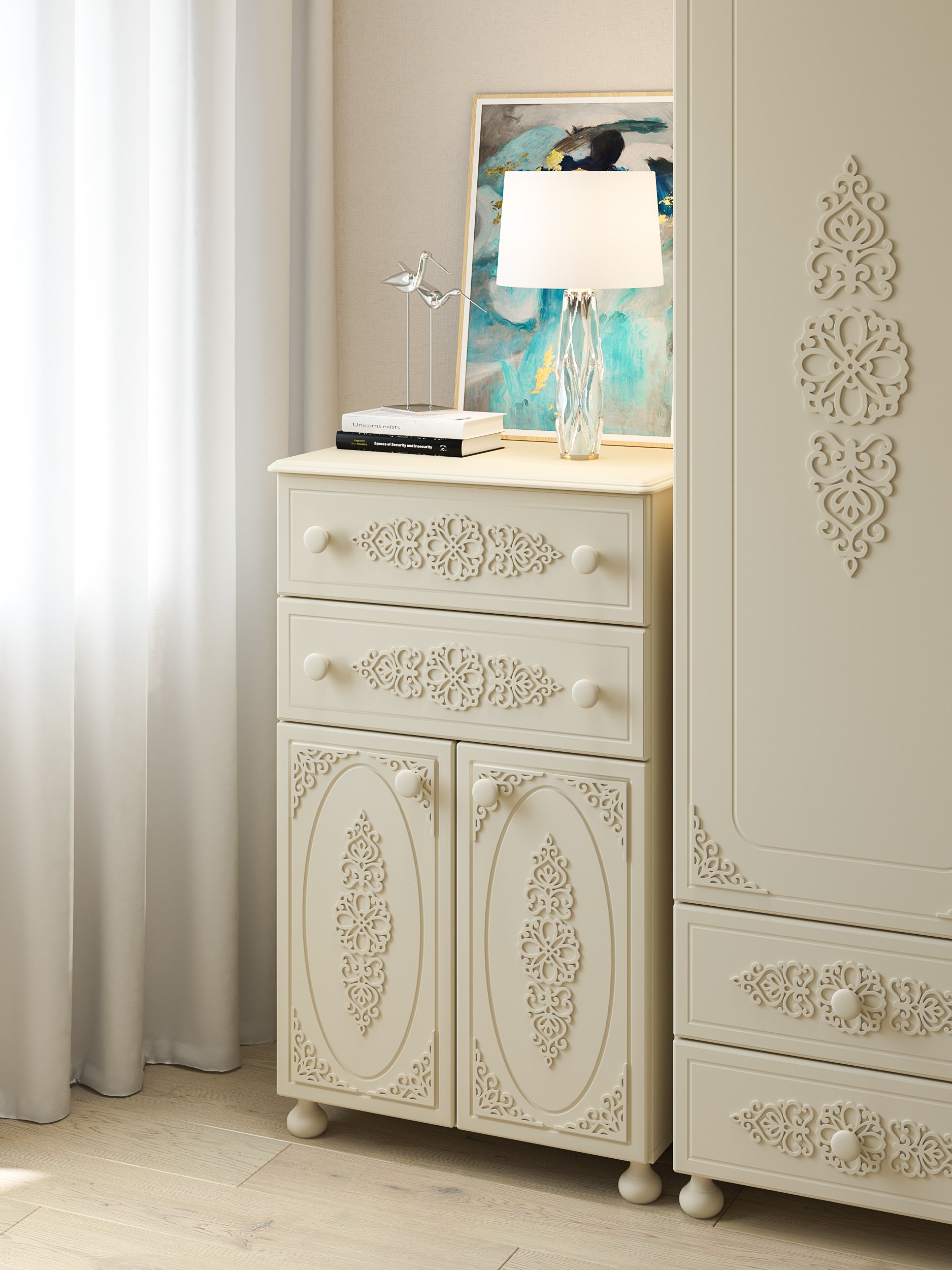 Роскошный комод из коллекции мебели Ассоль АС-63, несомненно, станет украшением Вашей гостиной или спальни. Выдвижные ящики оснащены современными телескопическими направляющими, обеспечивающие плавное и бесшумное выдвижение просторных ящиков. Распашные дверцы имеют качественные петли с плавными доводчиками закрывания. Фурнитура: петли с доводчиками, телескопические направляющие полного выдвижения. Высота опоры 65 мм. Мебель изготовлена из качественной ламинированной ДСП 16 мм. В оформлении фасадов МДФ применяется уникальная технология нанесения объемного узора 3D.