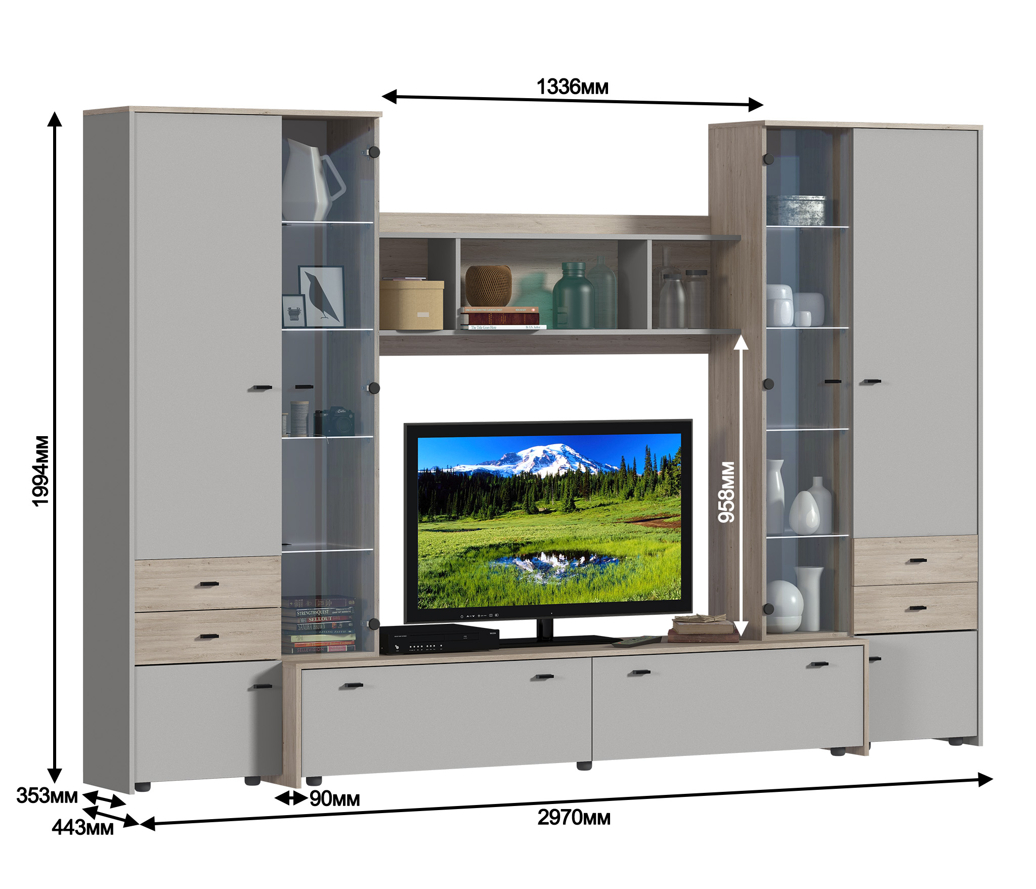 Стенка Магия СБ-2497/1 – практичный и стильный предмет мебели, который станет идеальным дополнением интерьера гостиной. Габаритные размеры – ширина 297 см, высота 199 см, глубина 44 см.