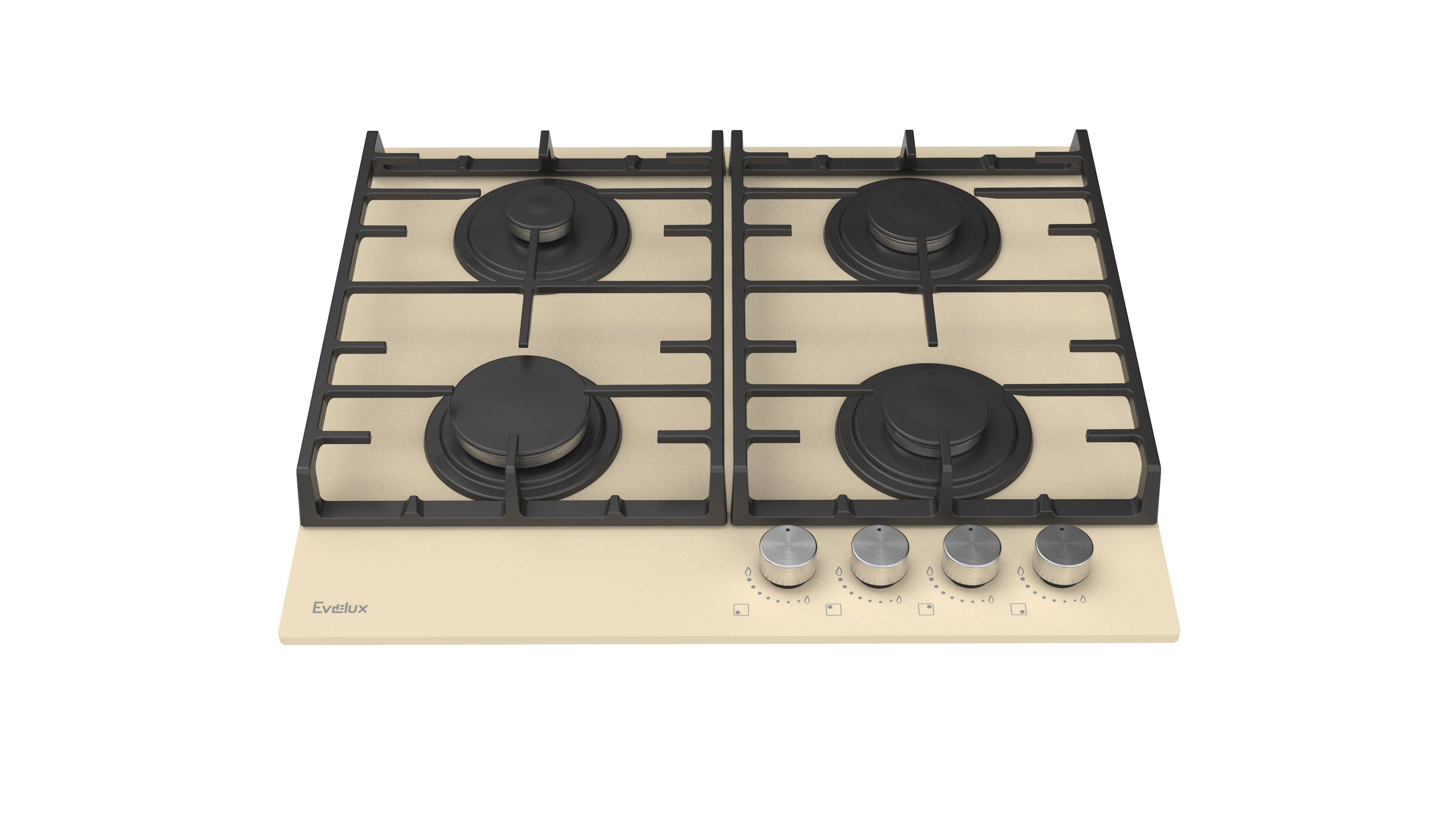Варочная панель газовая, 60 см, 4 конфорки: экономичная конфорка (0,9 кВт), 2 стандартных конфорки (2х1,7 кВт), экспресс-конфорка (2,9 кВт), электроподжиг, бежевое высокопрочное закаленное стекло, чугунные решетки, поворотные переключатели, комплект форсунок-переходников на балонный газ, 590х515х120 мм.