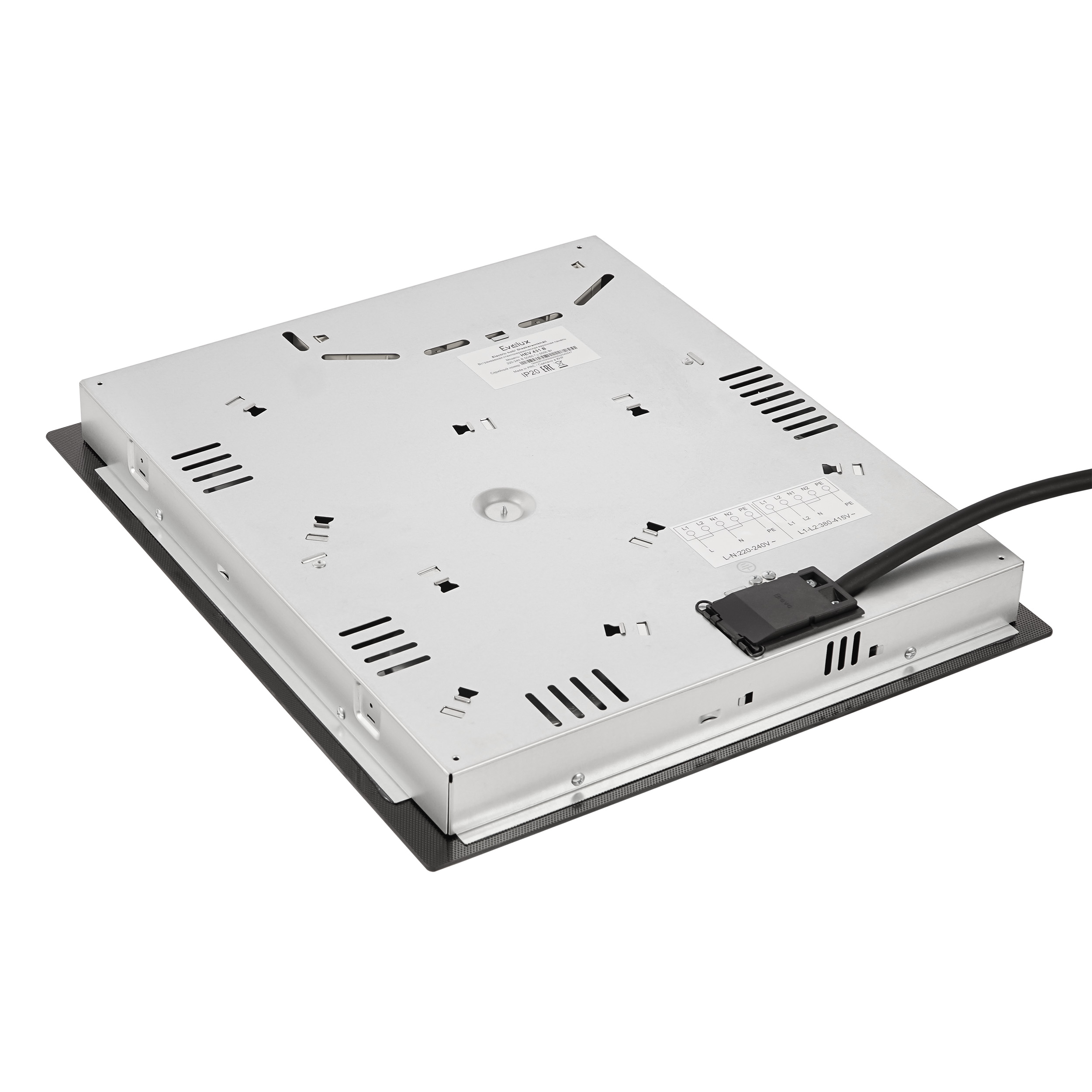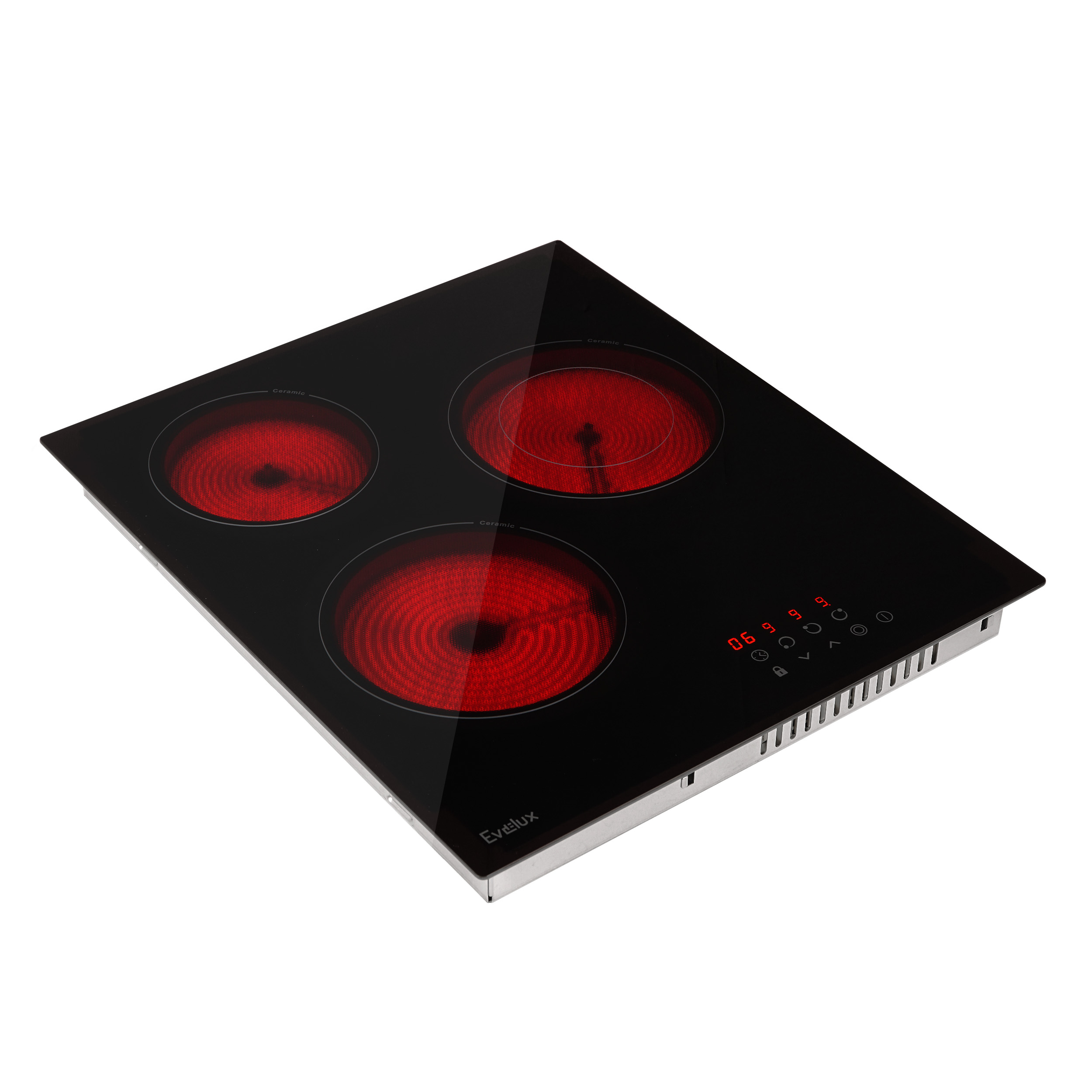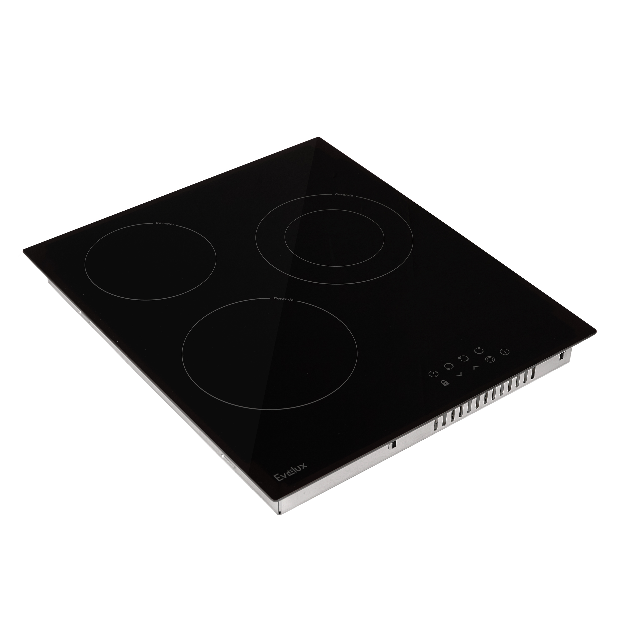 Варочная панель электрическая, стеклокерамика, Hi Light, 45 см, 3 конфорки, сенсорное управление, 9 уровней мощности, таймер 1-99 мин, блокировка управления, защитное отключение, двухконтурная, 5000 Вт, черное стекло, 450х520х50 мм.