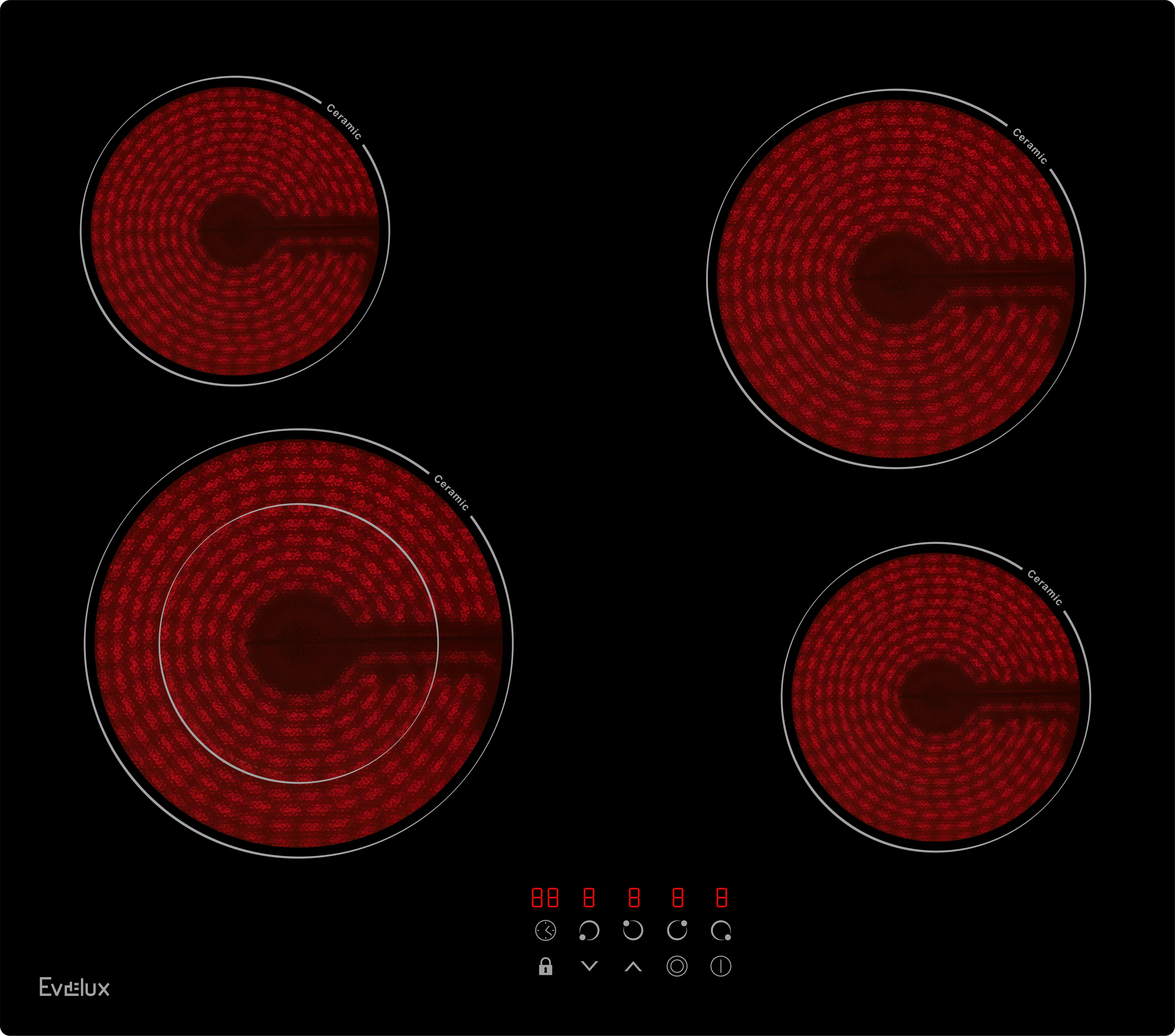 Зоны нагрева Evelux оборудованы современными нагревательными элементами Hi-light. Конфорка достигает установленной рабочей температуры буквально за считанные секунды, позволяет плавно регулировать мощность.