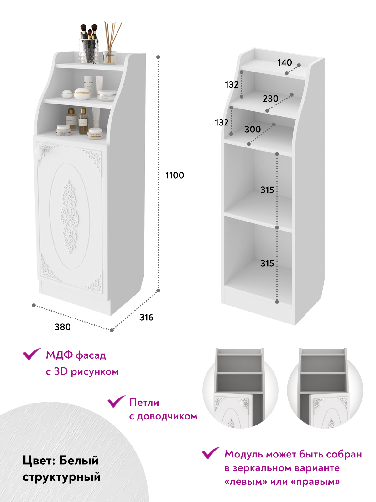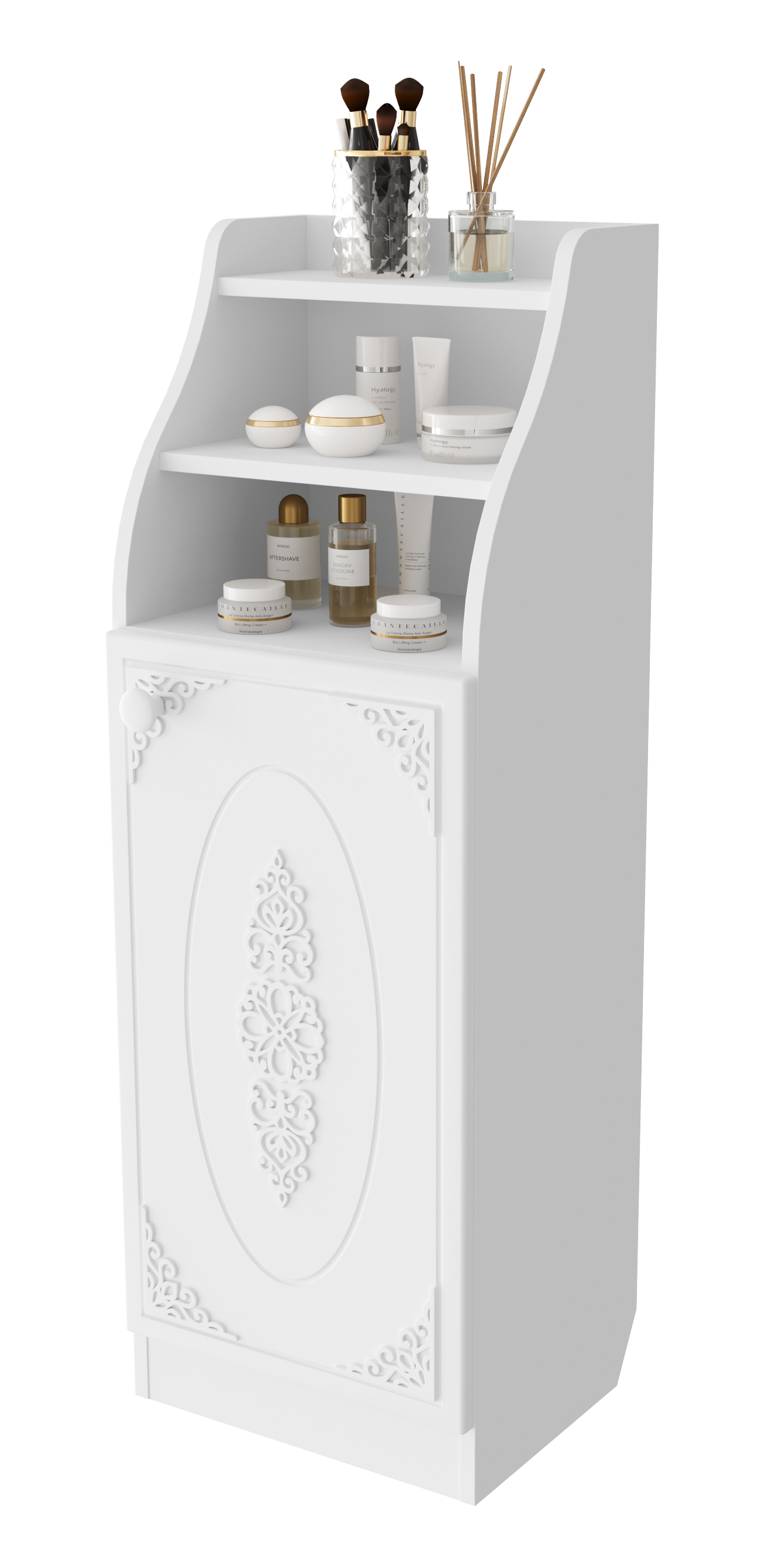 Стеллаж Ассоль АС-64, исполненный в стиле Прованс, прекрасно подойдет для вашей квартиры или загородного дома. Выполненный из качественных материалов, этот стеллаж порадует Вас своей практичностью и долговечностью. Особый шарм изделию придает уникальный фасад с изящным объемным узором. Стеллаж Ассоль АС-64 имеет две открытых верхних ниши и закрытые распашной дверцей полки внизу. Модуль может быть собран с дверцей, открывающейся как на правую, так и на левую сторону. Для этого необходимо по часовой стрелке развернуть фасад изделия на 180 градусов. Дверца крепится на петли с доводчиками. Изделие поставляется в разобранном виде, в фабричной упаковке, с инструкцией по сборке и полным комплектом фурнитуры.