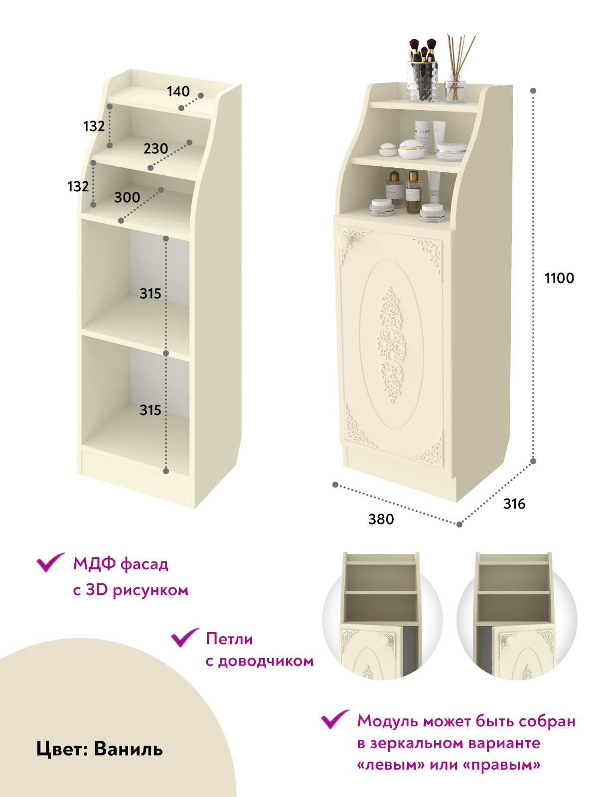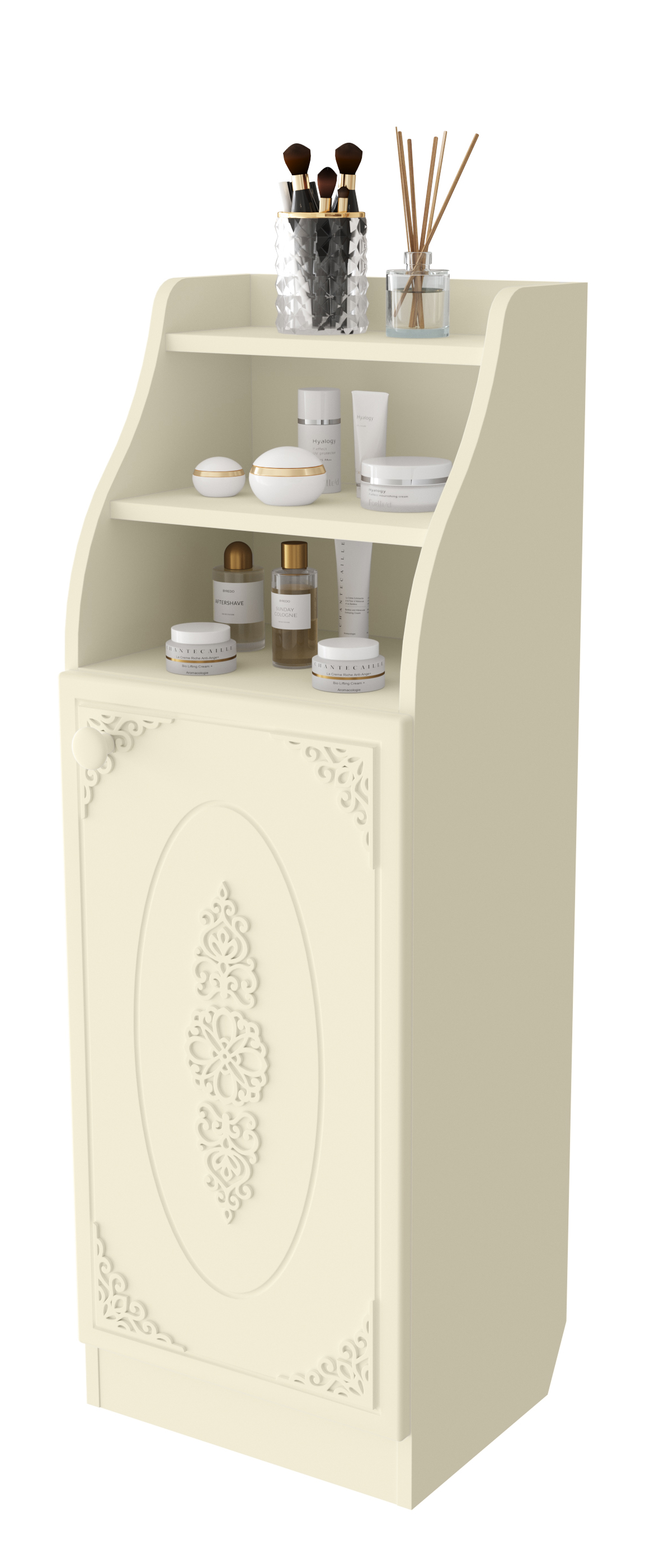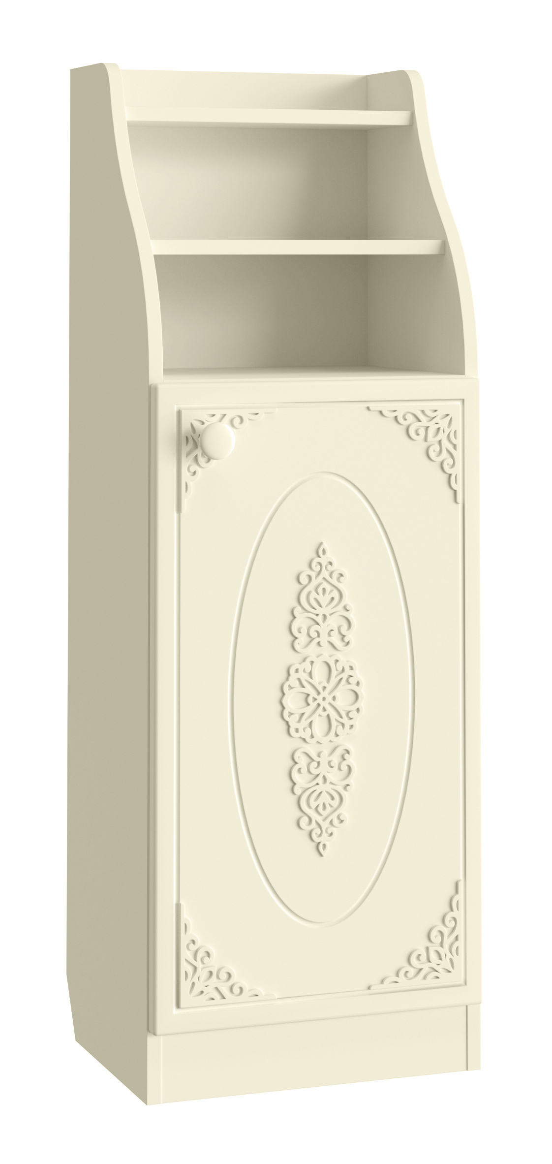 Стеллаж Ассоль АС-64, исполненный в стиле Прованс, прекрасно подойдет для вашей квартиры или загородного дома. Выполненный из качественных материалов, этот стеллаж порадует Вас своей практичностью и долговечностью. Особый шарм изделию придает уникальный фасад с изящным объемным узором. Стеллаж Ассоль АС-64 имеет две открытых верхних ниши и закрытые распашной дверцей полки внизу. Модуль может быть собран с дверцей, открывающейся как на правую, так и на левую сторону. Для этого необходимо по часовой стрелке развернуть фасад изделия на 180 градусов. Дверца крепится на петли с доводчиками. Изделие поставляется в разобранном виде, в фабричной упаковке, с инструкцией по сборке и полным комплектом фурнитуры.