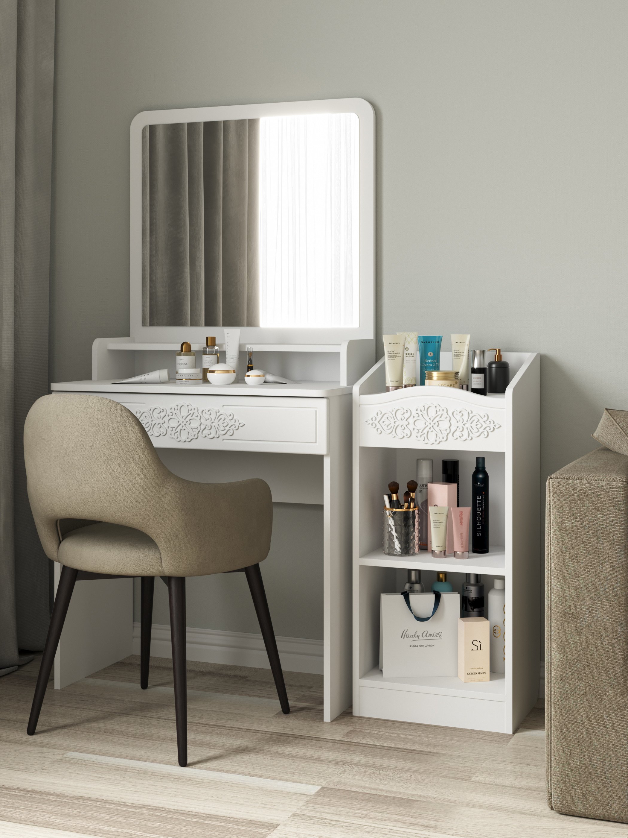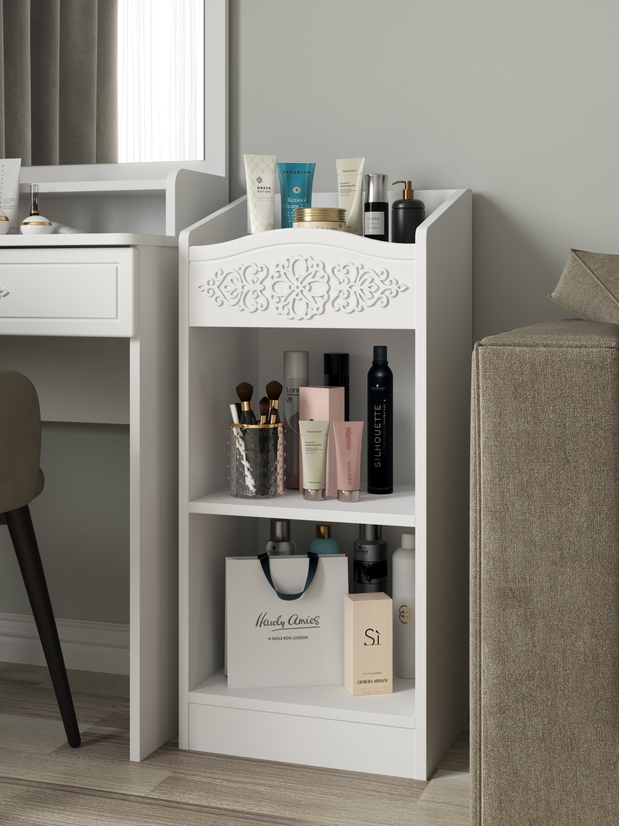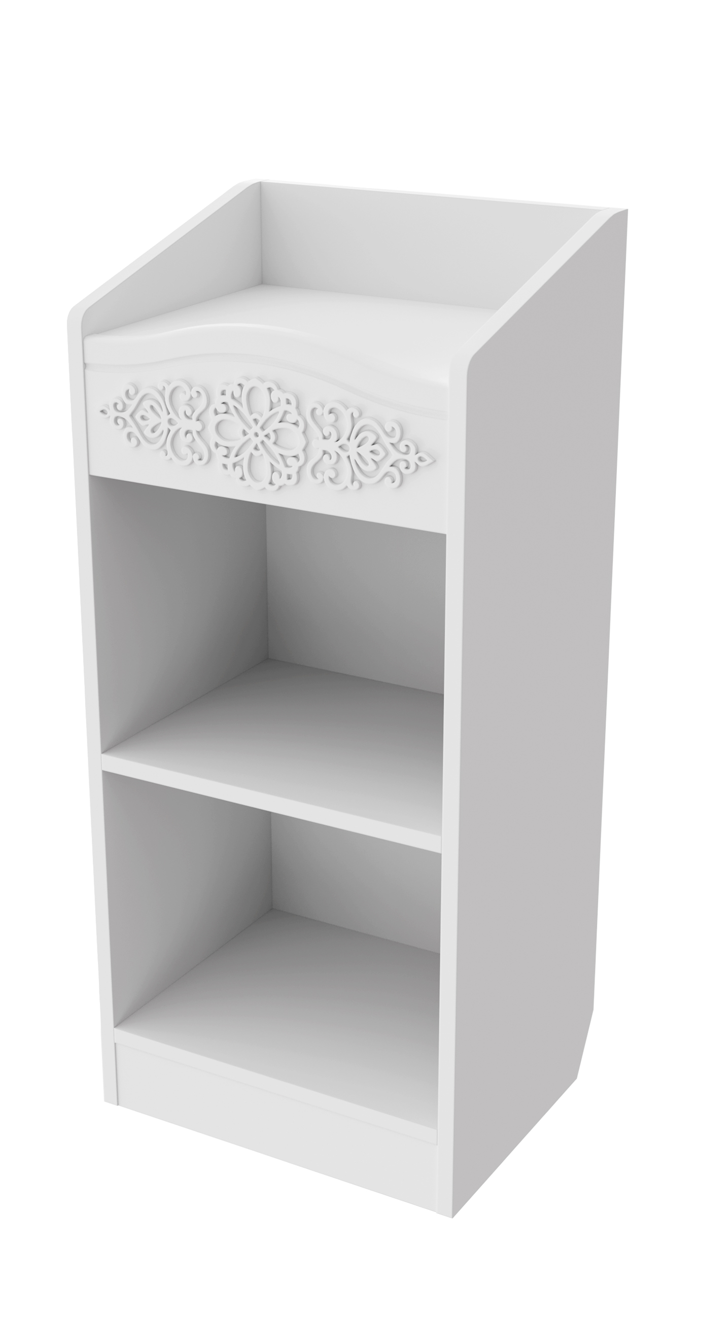 Шкаф АС-66 прекрасно дополнит ваш туалетный столик, создав дополнительное место для хранения книг, парфюмерии и разных аксессуаров. Мебель изготовлена из качественной ламинированной ДСП 16 мм. В оформлении фасадов МДФ применяется уникальная технология нанесения объемного узора 3D.
